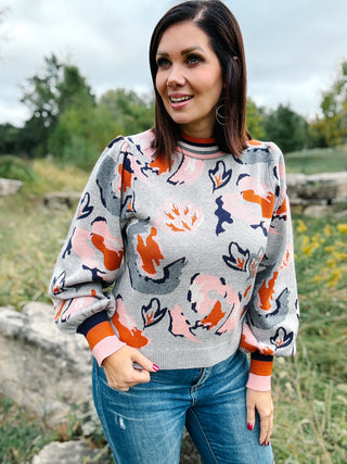 Carter Sweater by THML - Grey with Pink and Navy Floral and Striped Collar