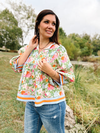 Alona Top - 3/4 Sleeve Floral Print with Multicolor Hem and Cuff Band and Split Neck
