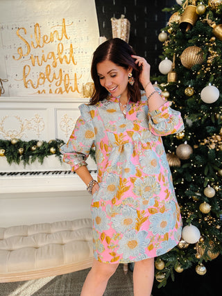 Brocade Ruffled Trim Dress by Ivy Jane - Blue and Pink Brocade Mini Dress