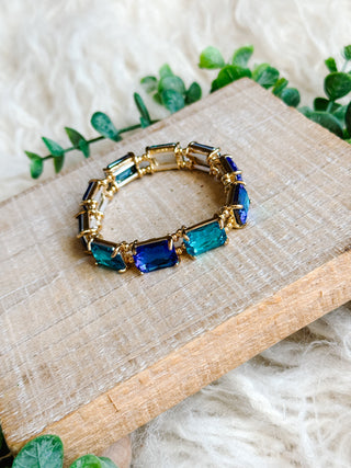 Odessa Bracelet - Gold Stretch Bracelet with Blue and Teal Faceted Rectangular Gems