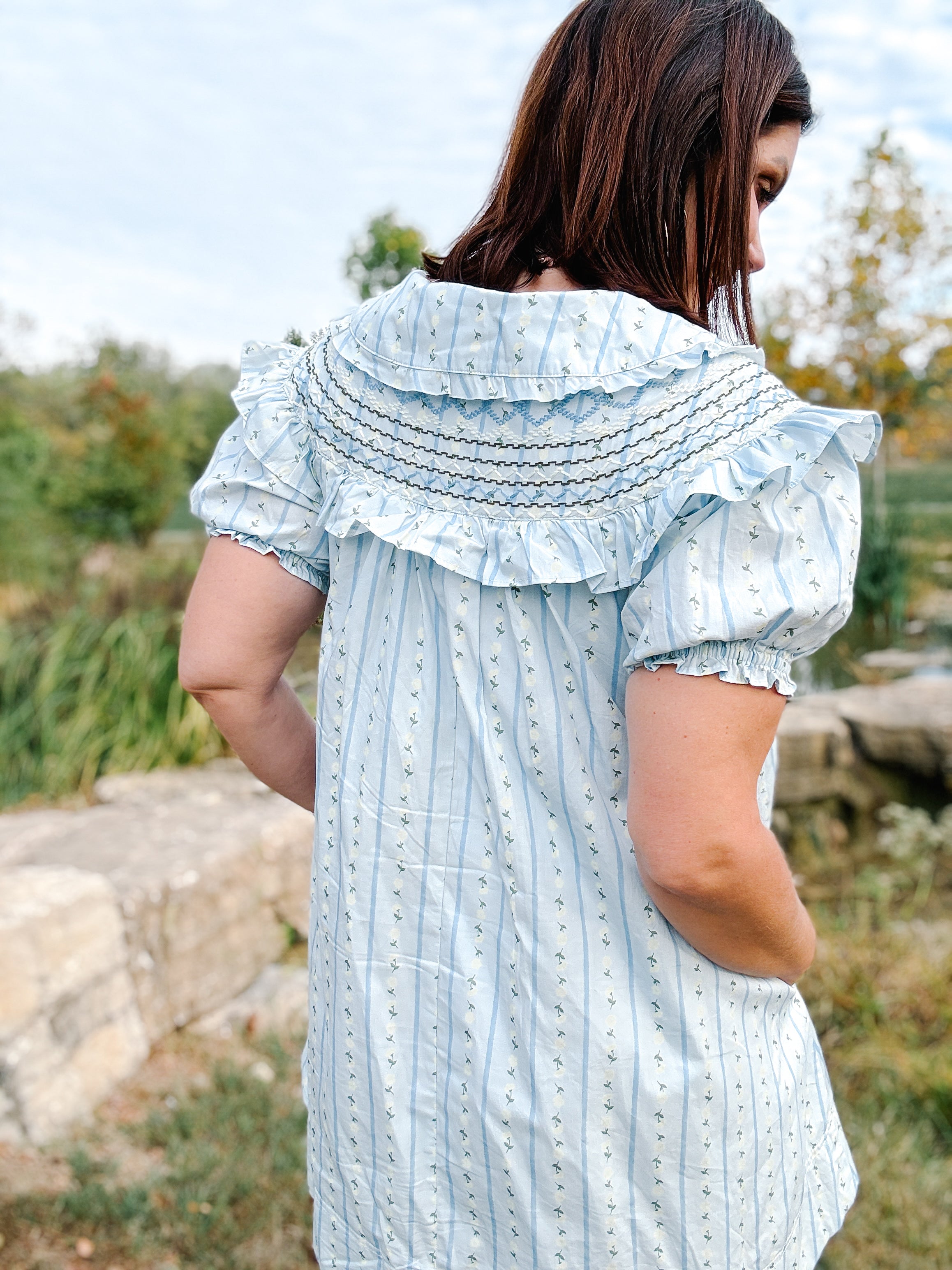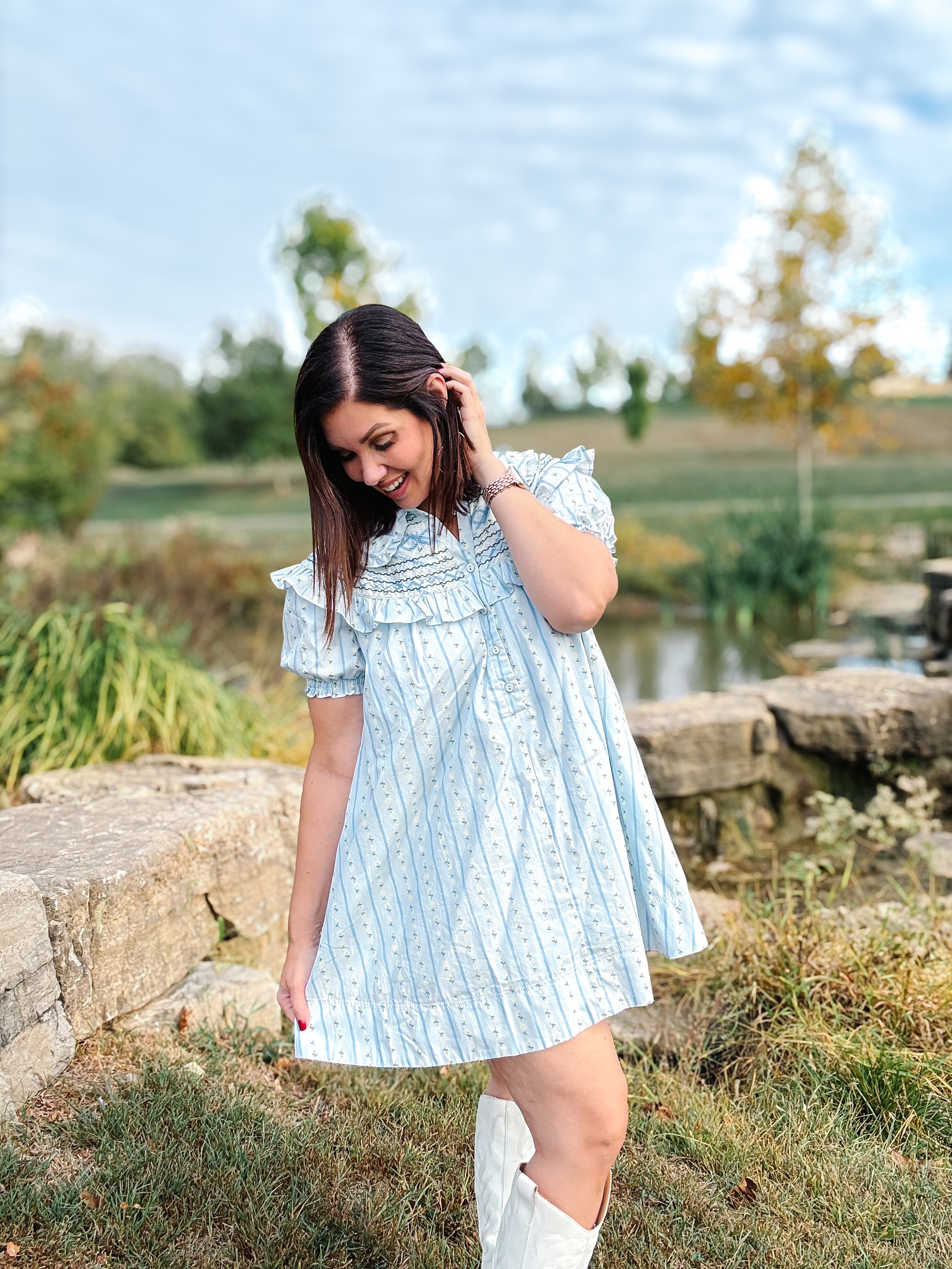 Have you been on the hunt for a feminine light blue ruffle mini dress with subtle floral print and embroidered detailing that's comfy and chic? This darling number bty Karlie has your name all over it—whether you're headed to brunch, book club, or just want to feel a little extra running errands.
