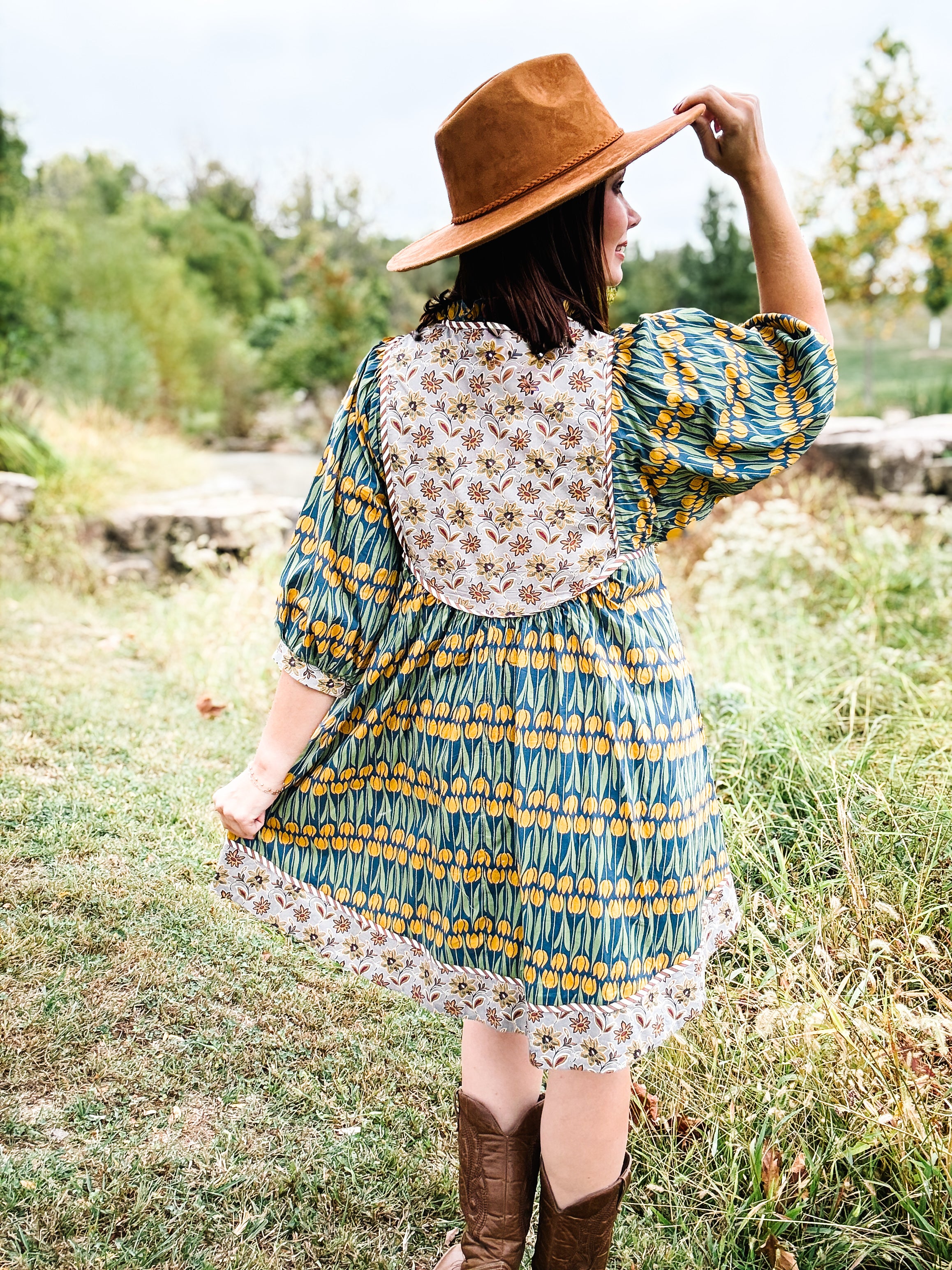 Have you been searching for a bold green and yellow floral mini dress with vintage-inspired charm and endless personality? The Marigold Dress delivers all of that and more—she’s a walking piece of art. Between the tulip stripe print, contrasting grey floral yoke, and swingy silhouette, this one is guaranteed to get you compliments from strangers (and jealous stares from friends).