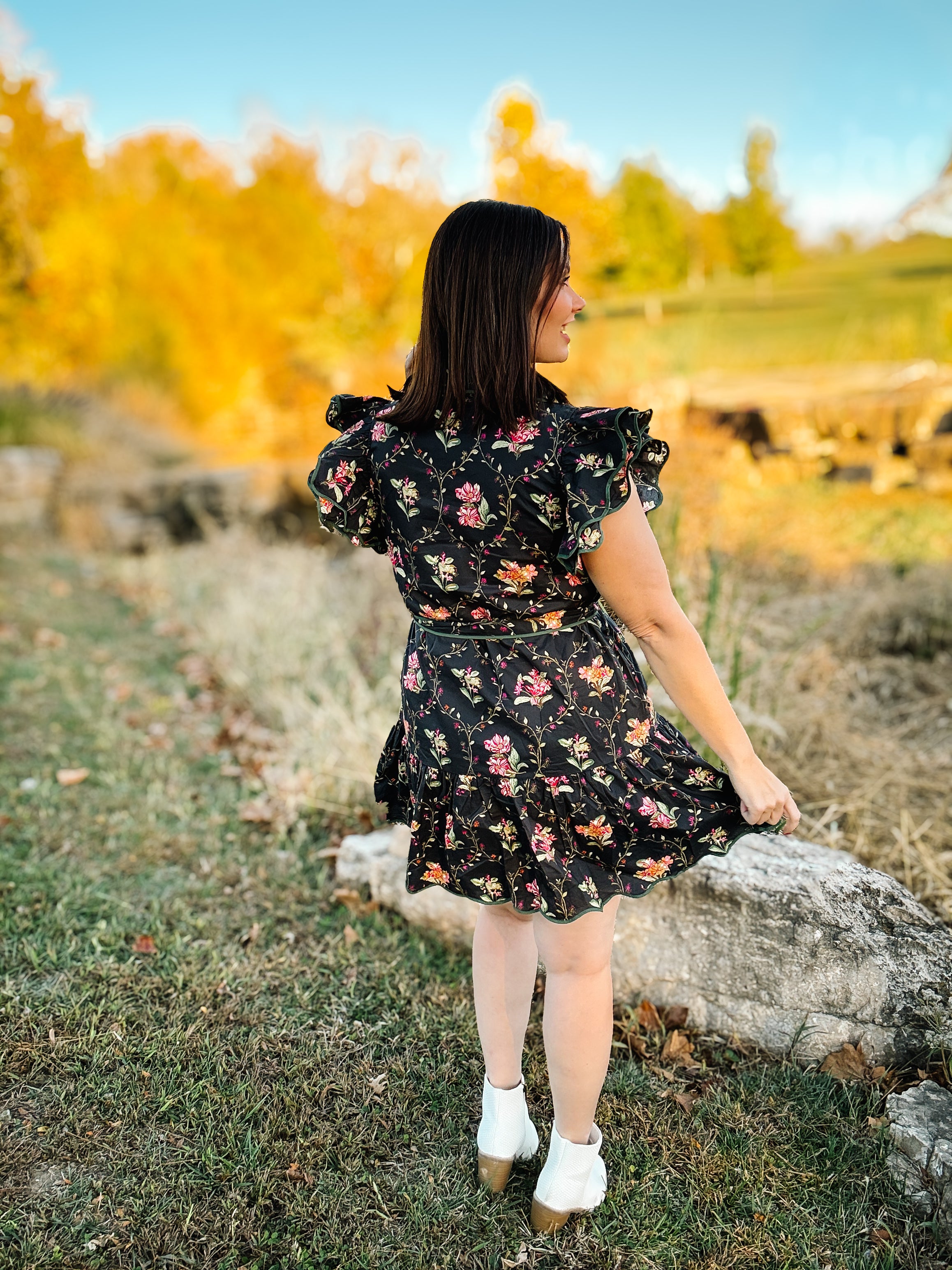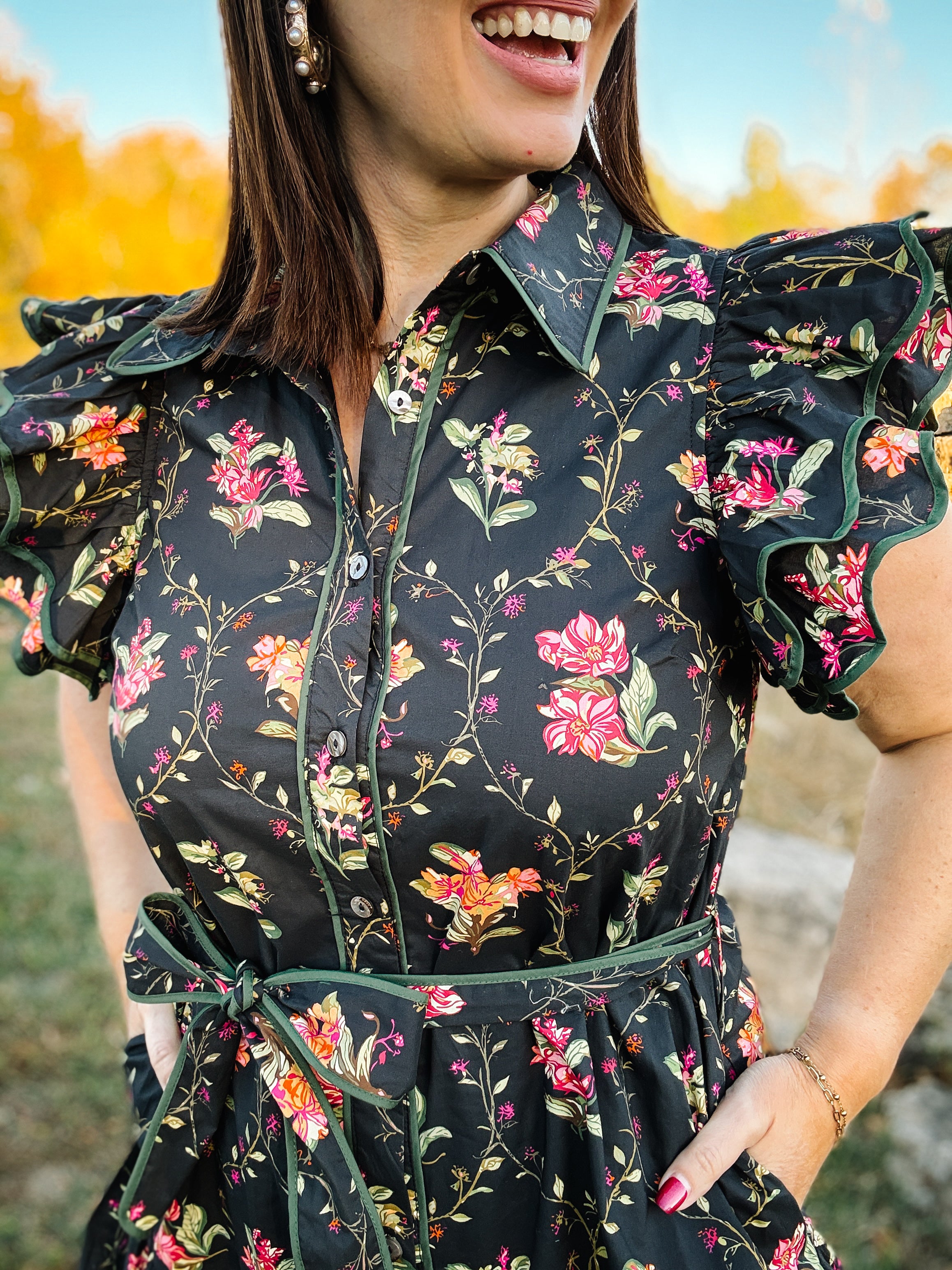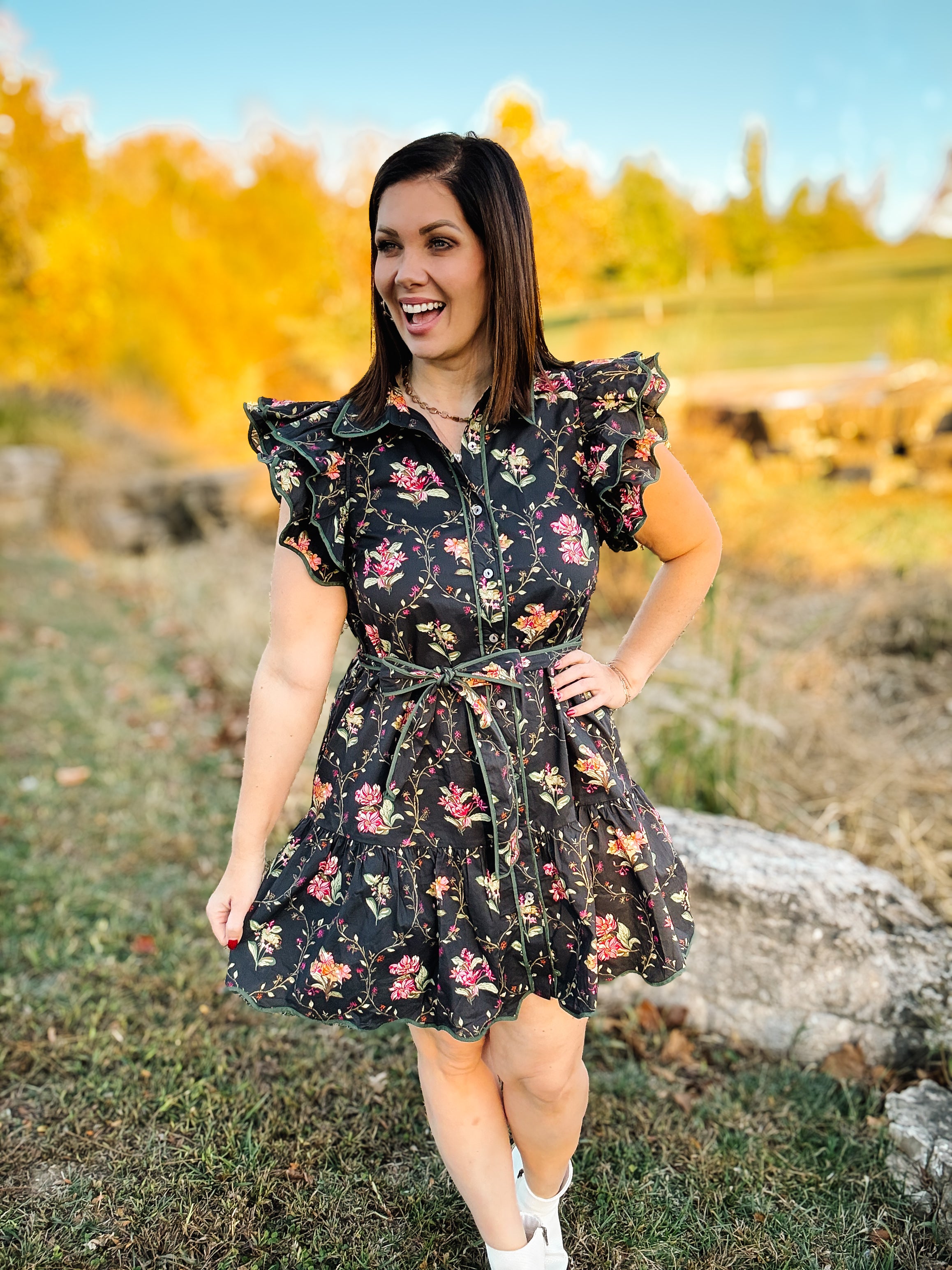 Roxelle Dress - Black Floral Mini Dress with Green Trim, Pockets, and Self Tie Belt
