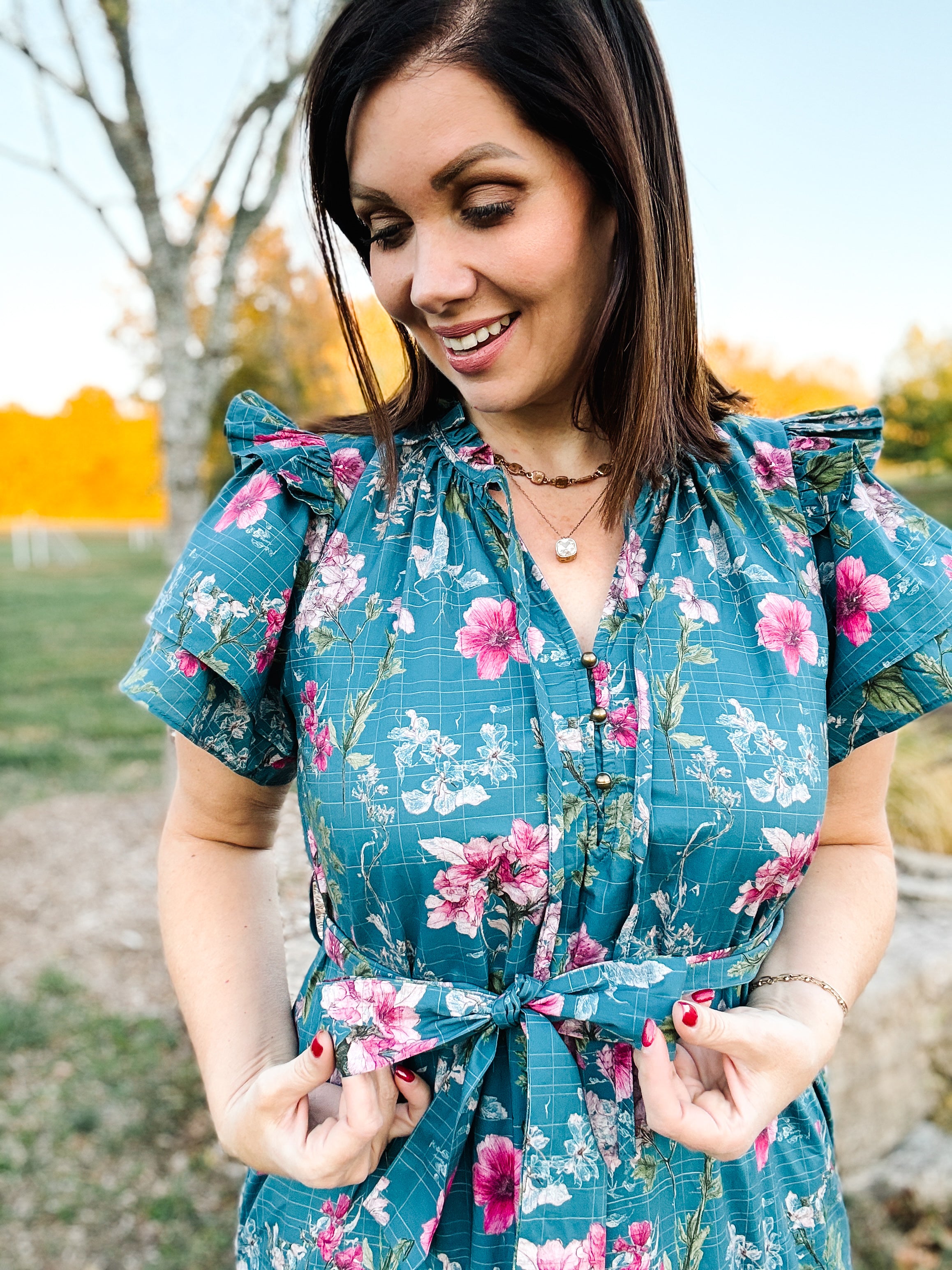 This beauty brings together the best of both worlds: soft feminine print meets crisp teal background with a subtle plaid texture, giving it an unexpected edge. With those sweet flutter sleeves, a flattering waist tie, and the tiered silhouette you know we’re obsessed with, she’s the kind of dress that makes errands feel extra and date nights feel dreamy. Just add boots and your favorite lip gloss.