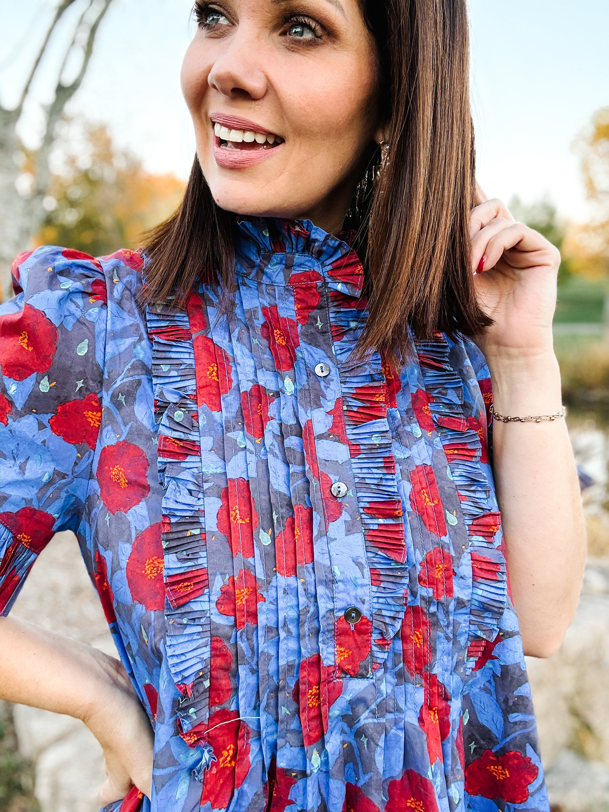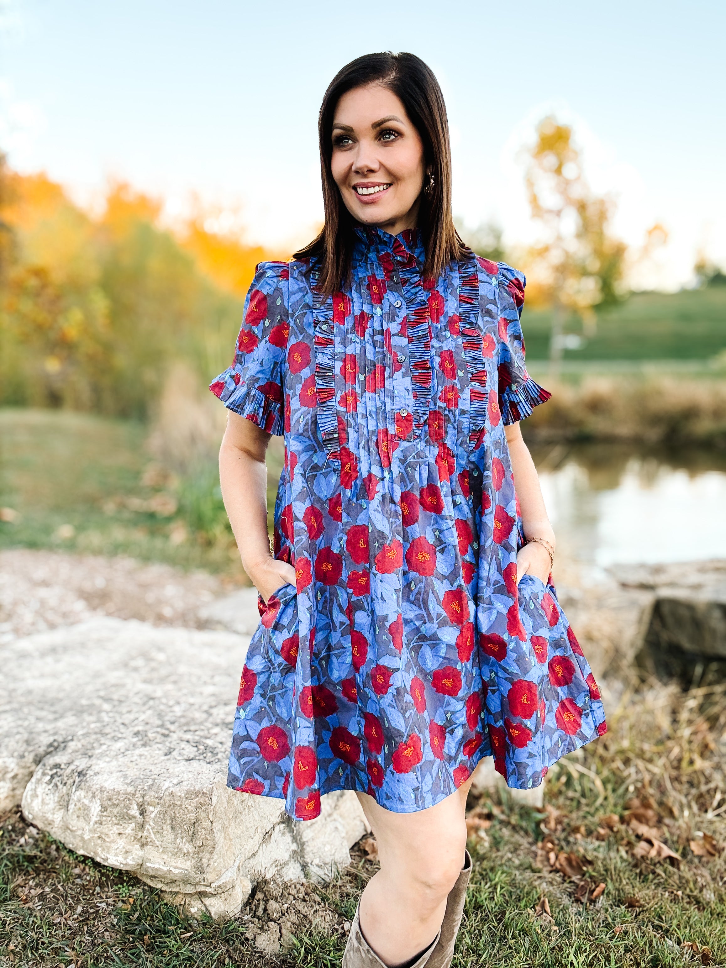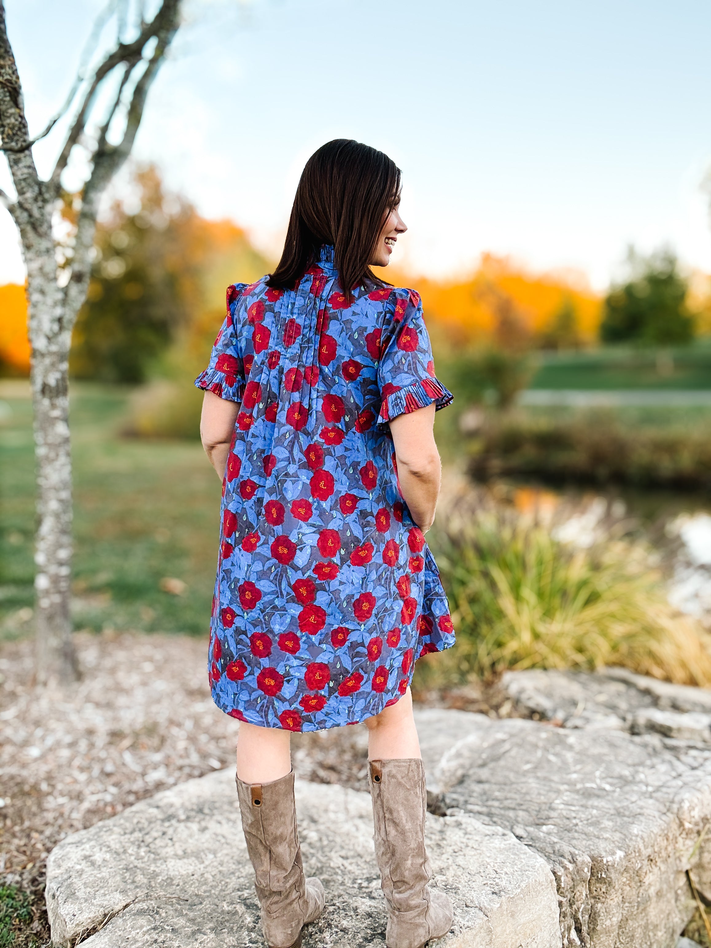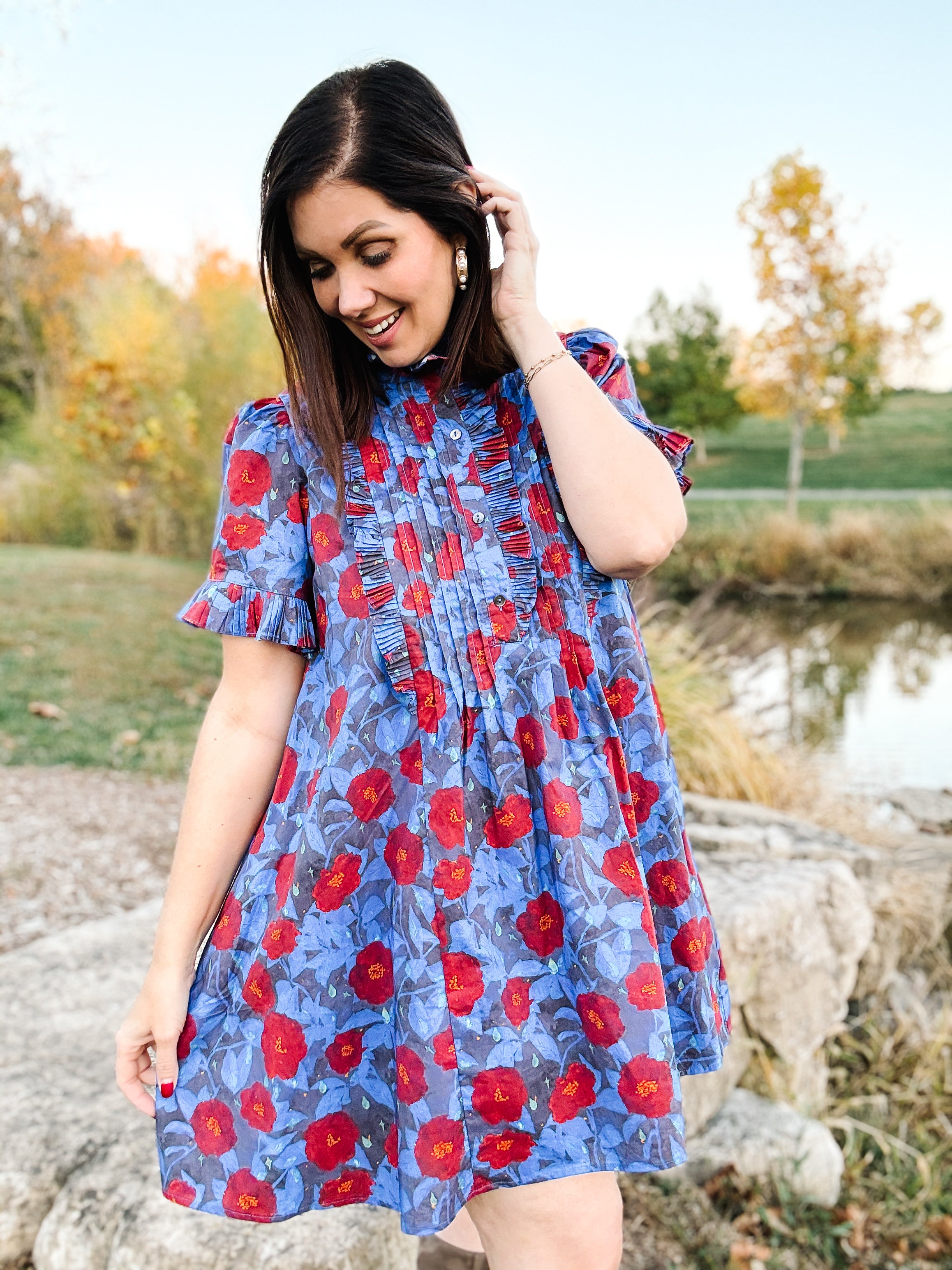 The Sabina Dress – Blue Floral High Neck Mini Dress with Ruffles and P – Mom Buns and Ruffles