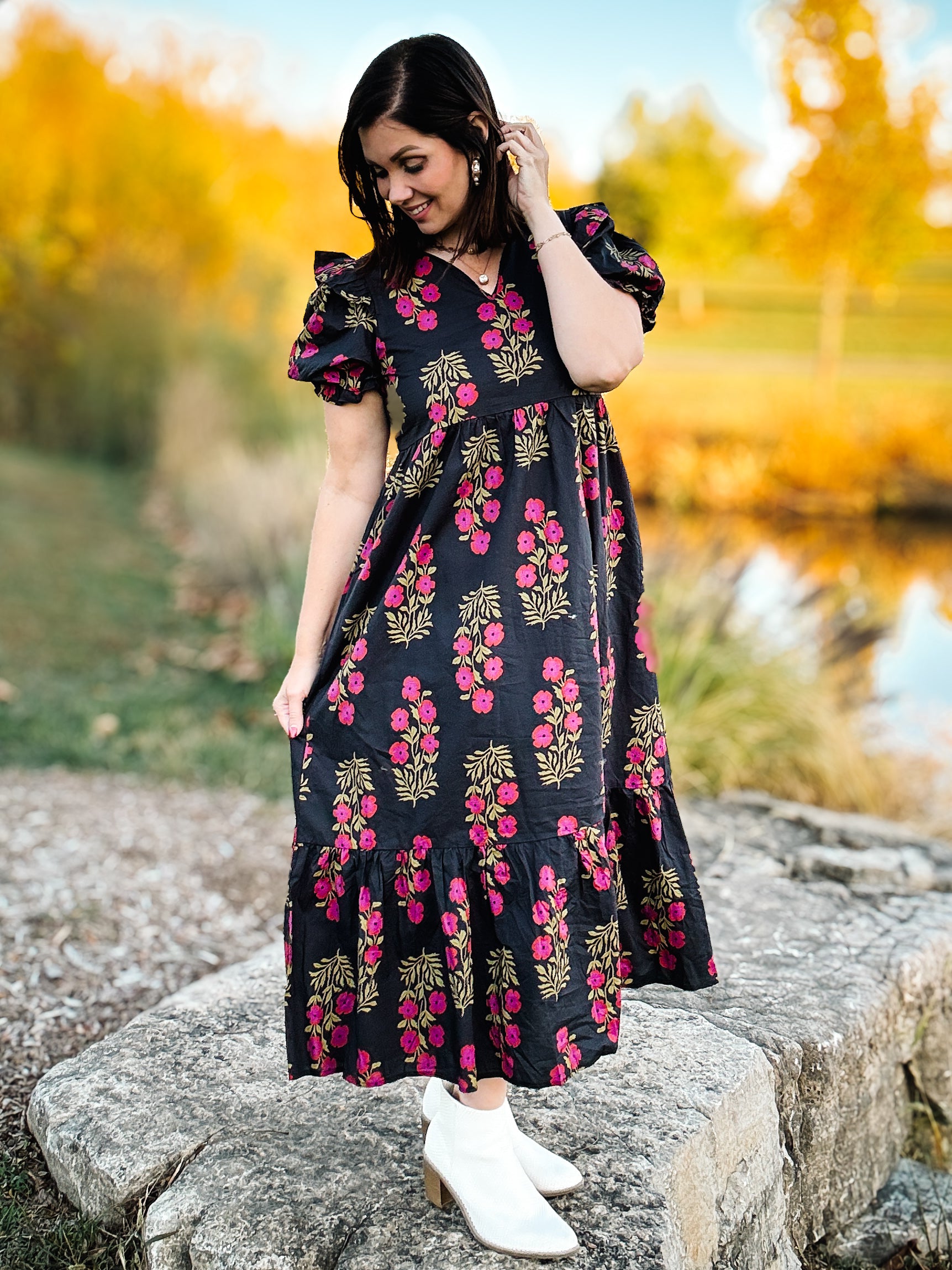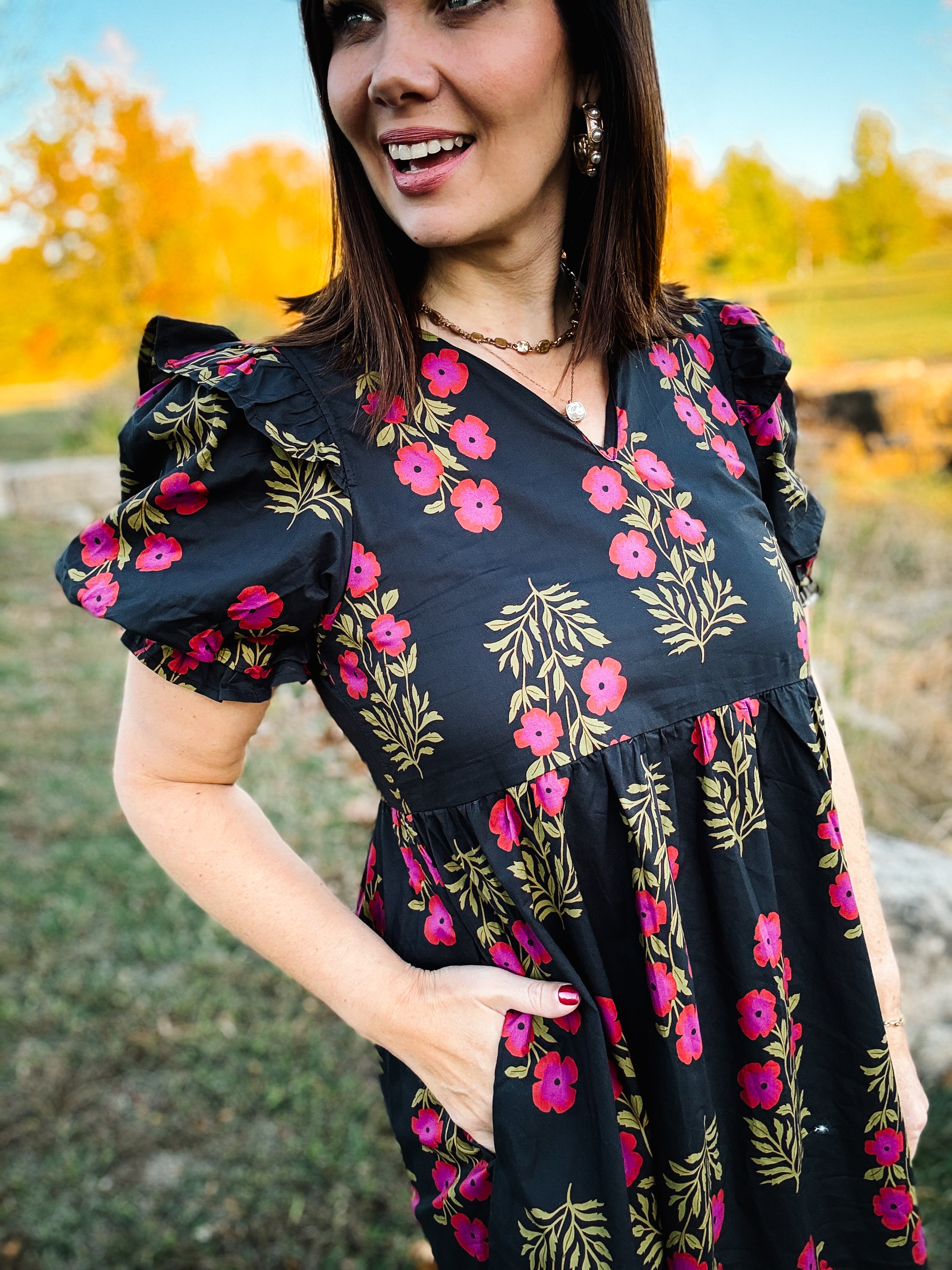 Have you been craving a bold black fall midi dress with bright floral drama, ruffled puff sleeves, and major twirl potential?