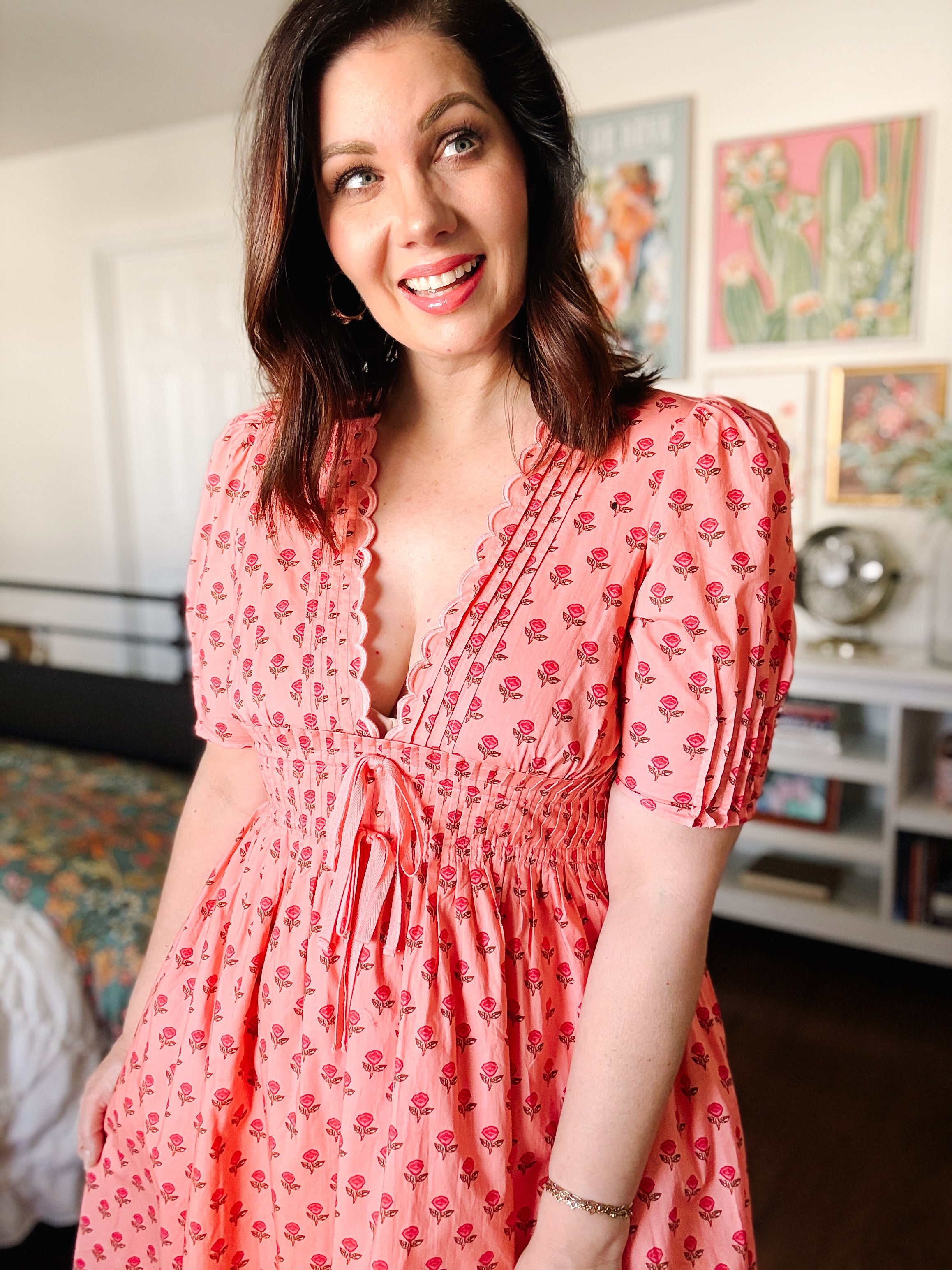 Have you been looking for a coral pink maxi dress with a tiny rose print, deep V-neckline, puff sleeves, smocked waist, and romantic scalloped trim that feels vintage-inspired but still totally wearable?