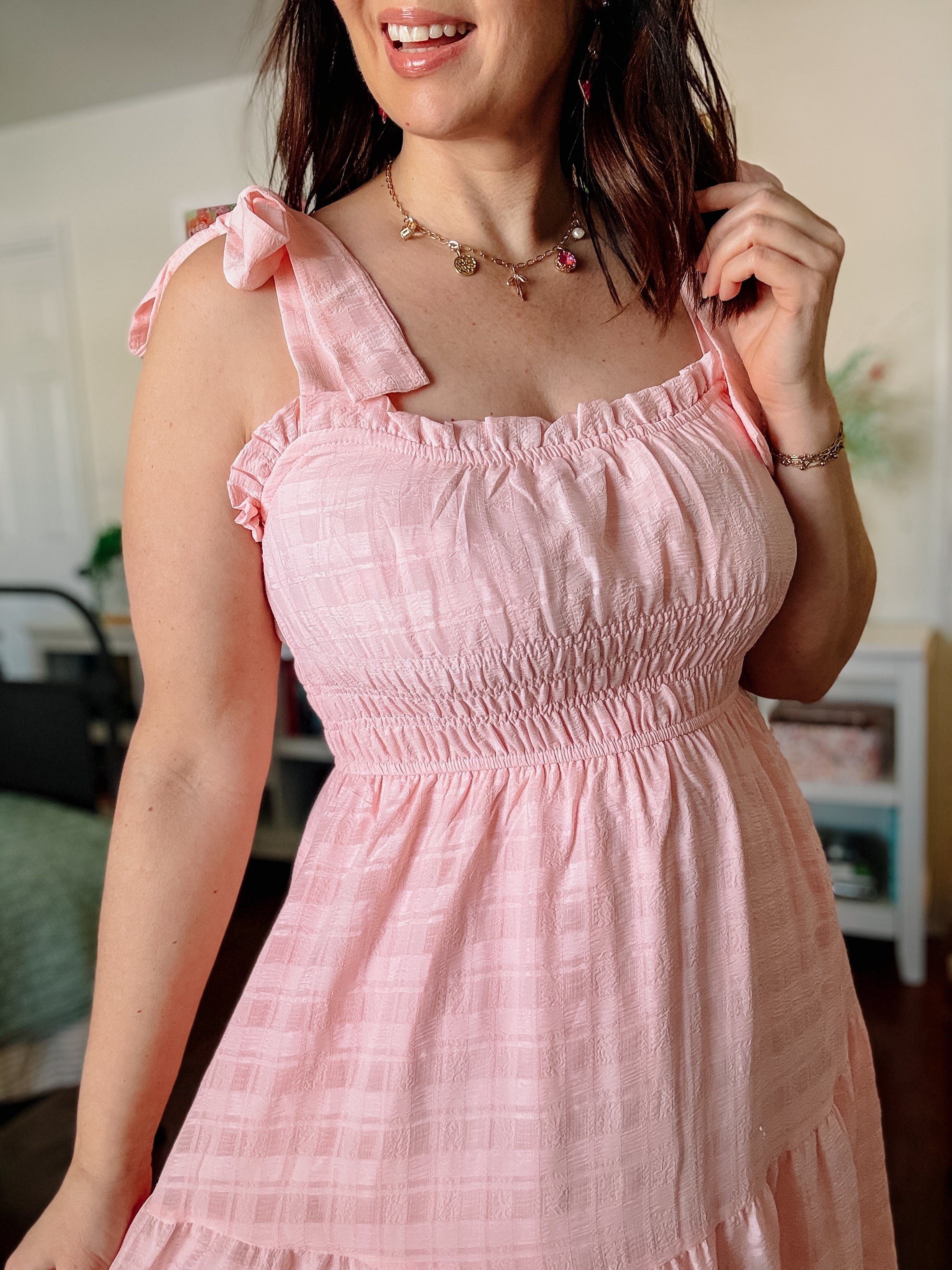 Have you been dreaming of the perfect soft pink cottagecore dress with tie shoulder straps that looks like it came straight from grandma’s biscuit tin—but make it flirty?