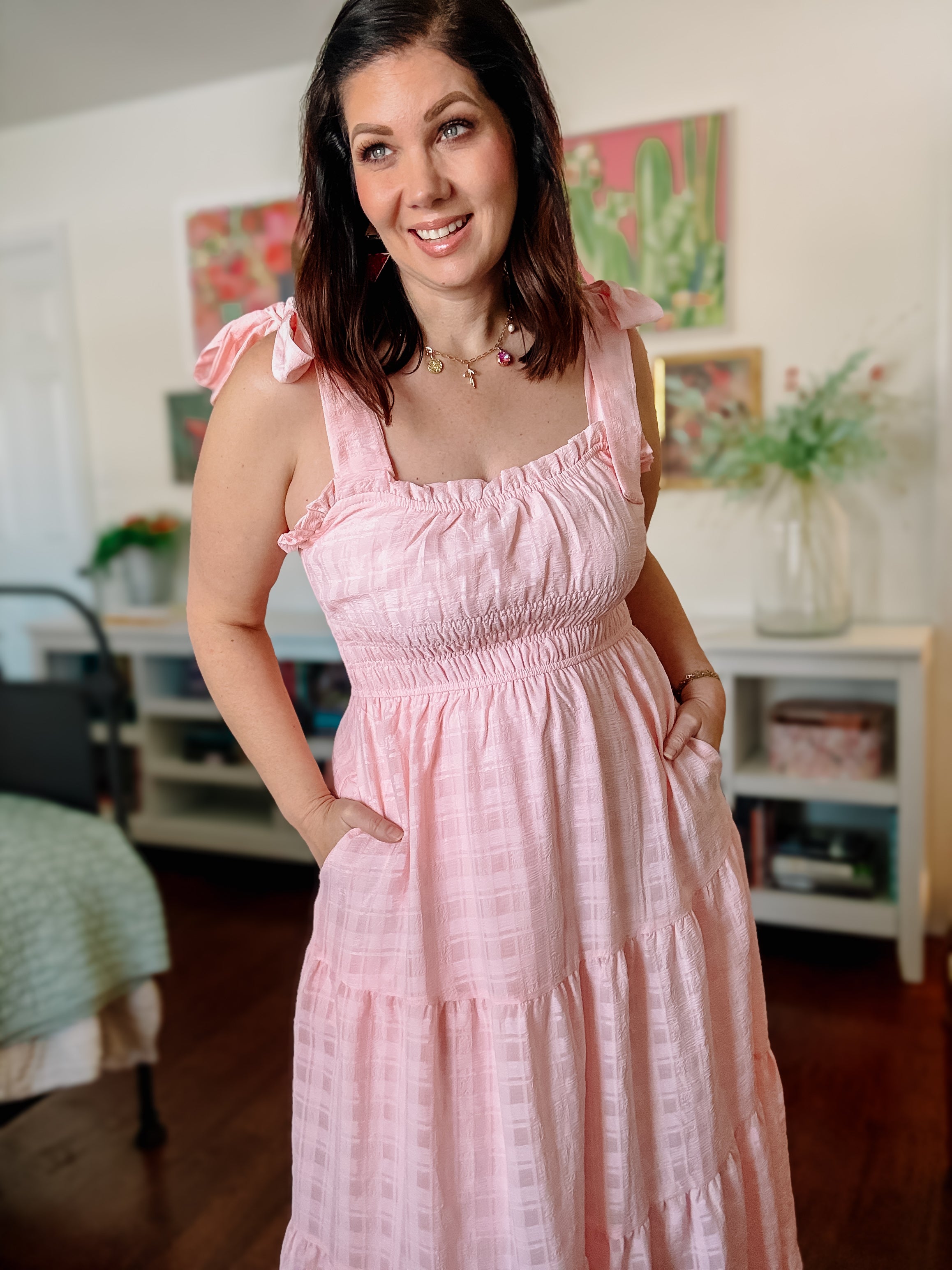 Meet the Summer Dress: a puff of cotton candy perfection with a silhouette that says “strawberry jam on warm biscuits” but a vibe that says “modern mama with main character energy.” Whether you’re headed to the farmer’s market, twirling barefoot in your backyard, or just romanticizing your Tuesday errands—this beauty has you fully covered in feminine charm.