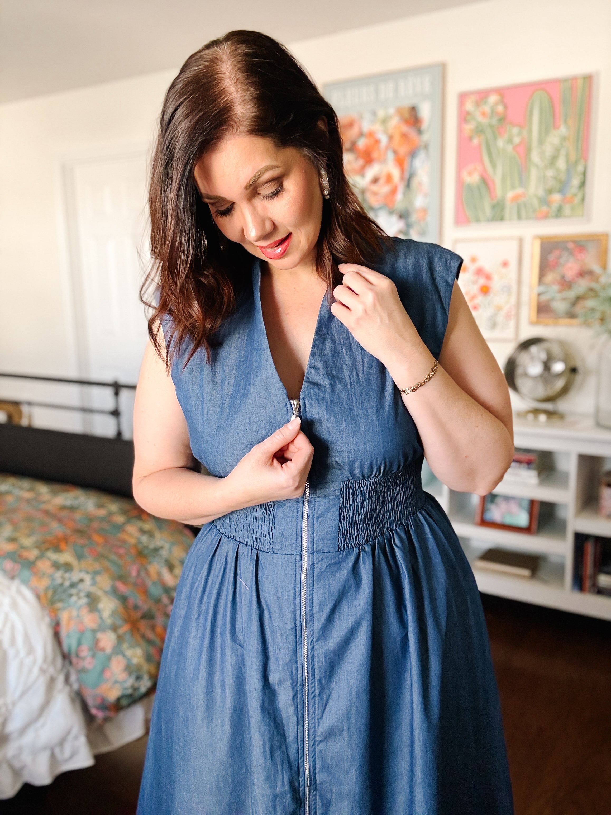 Because this is that dress — the one you throw on and instantly look styled without trying. The structured-but-soft denim feel gives it that elevated, boutique vibe, while the smocked waist does the absolute most (in the best way) for your shape. And the zipper? It’s giving cool-girl polish with just enough edge.