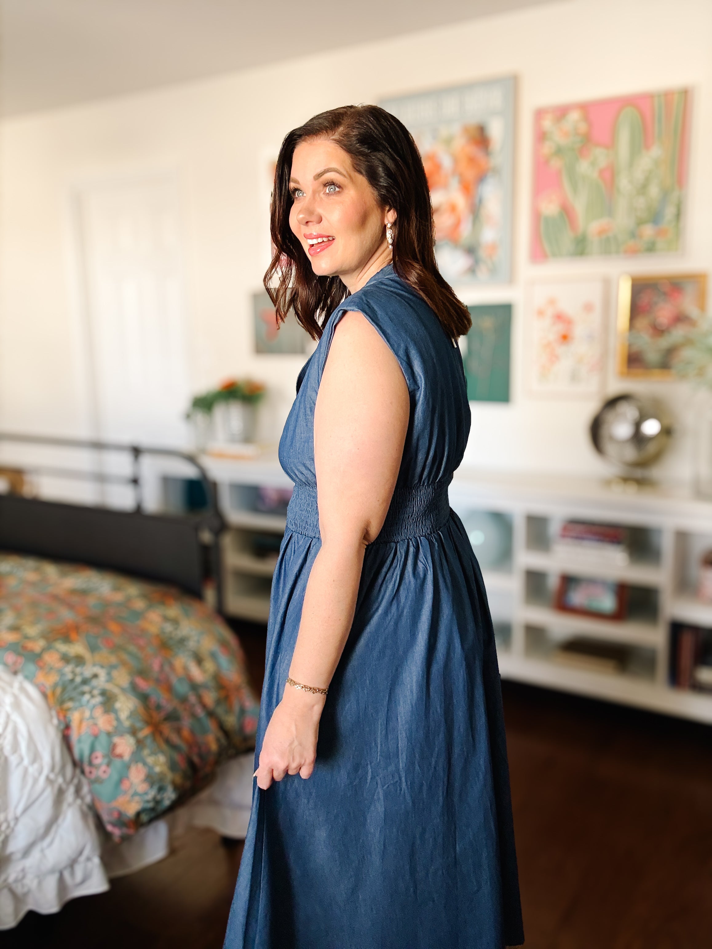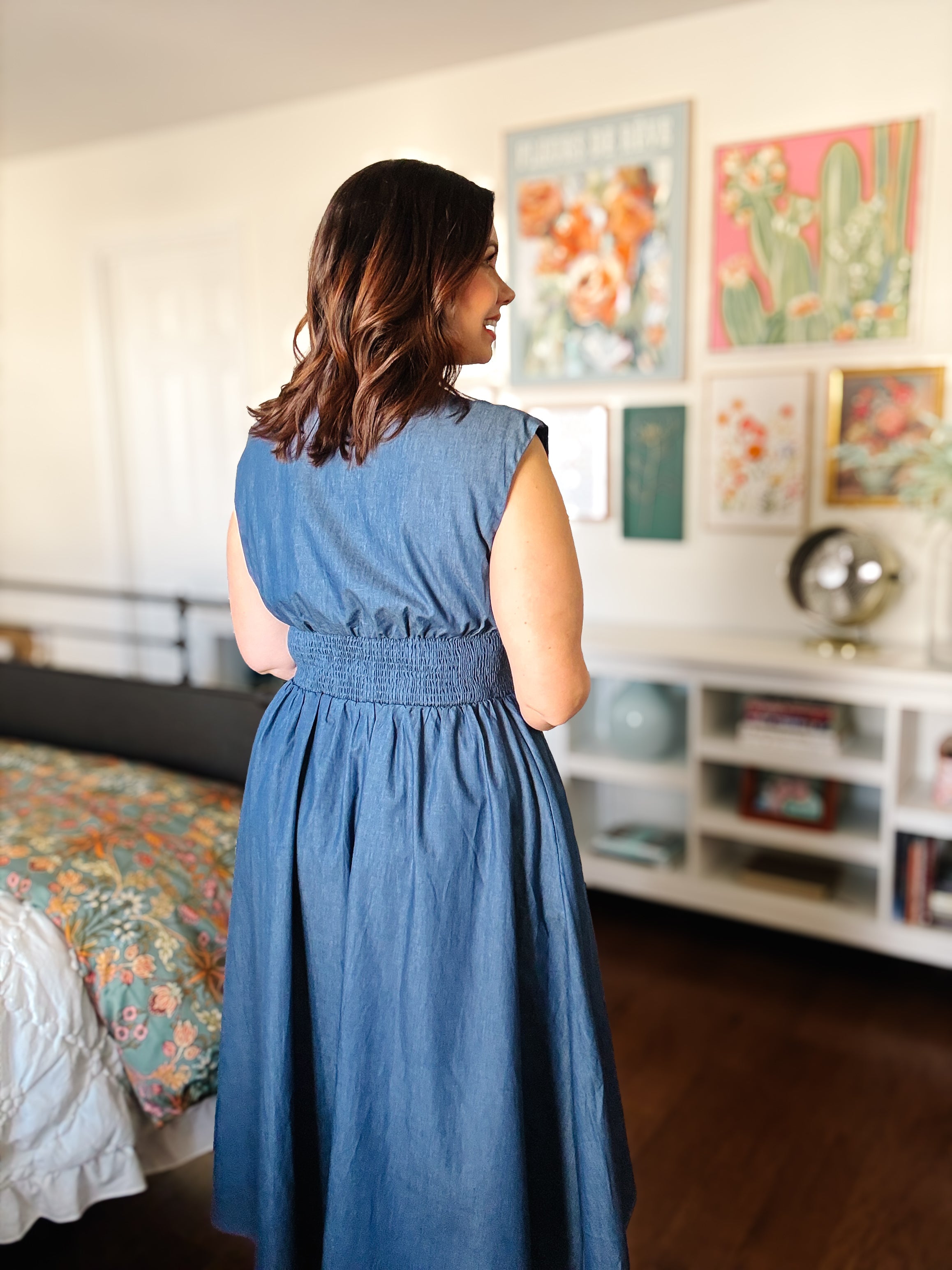 Have you been looking for a flattering denim-look sleeveless midi dress with a zip front, smocked waist, and pockets that you can wear from brunch to date night?