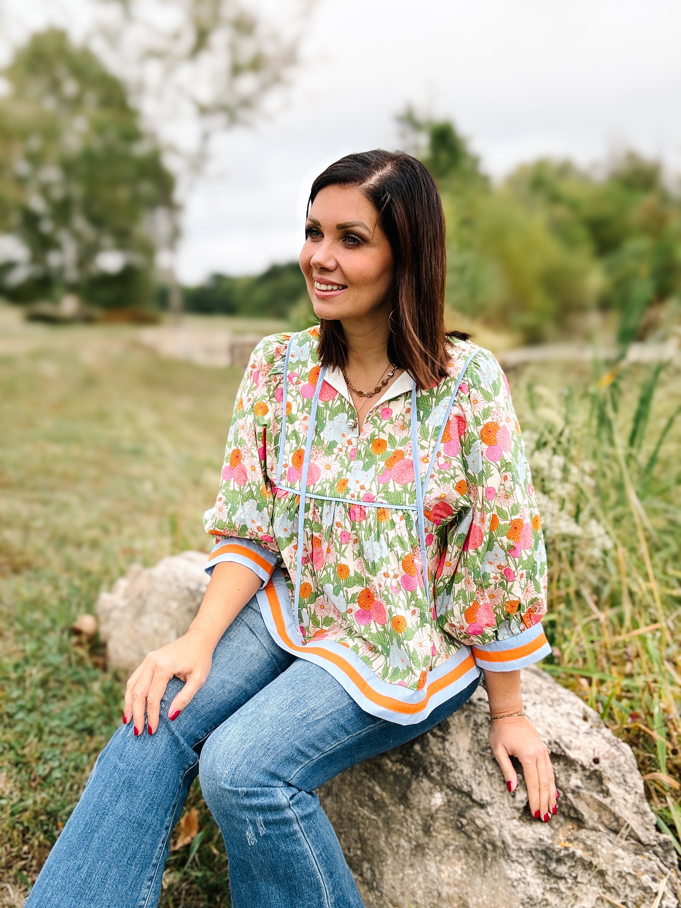 Alona Top - 3/4 Sleeve Floral Print with Multicolor Hem and Cuff Band and Split Neck
