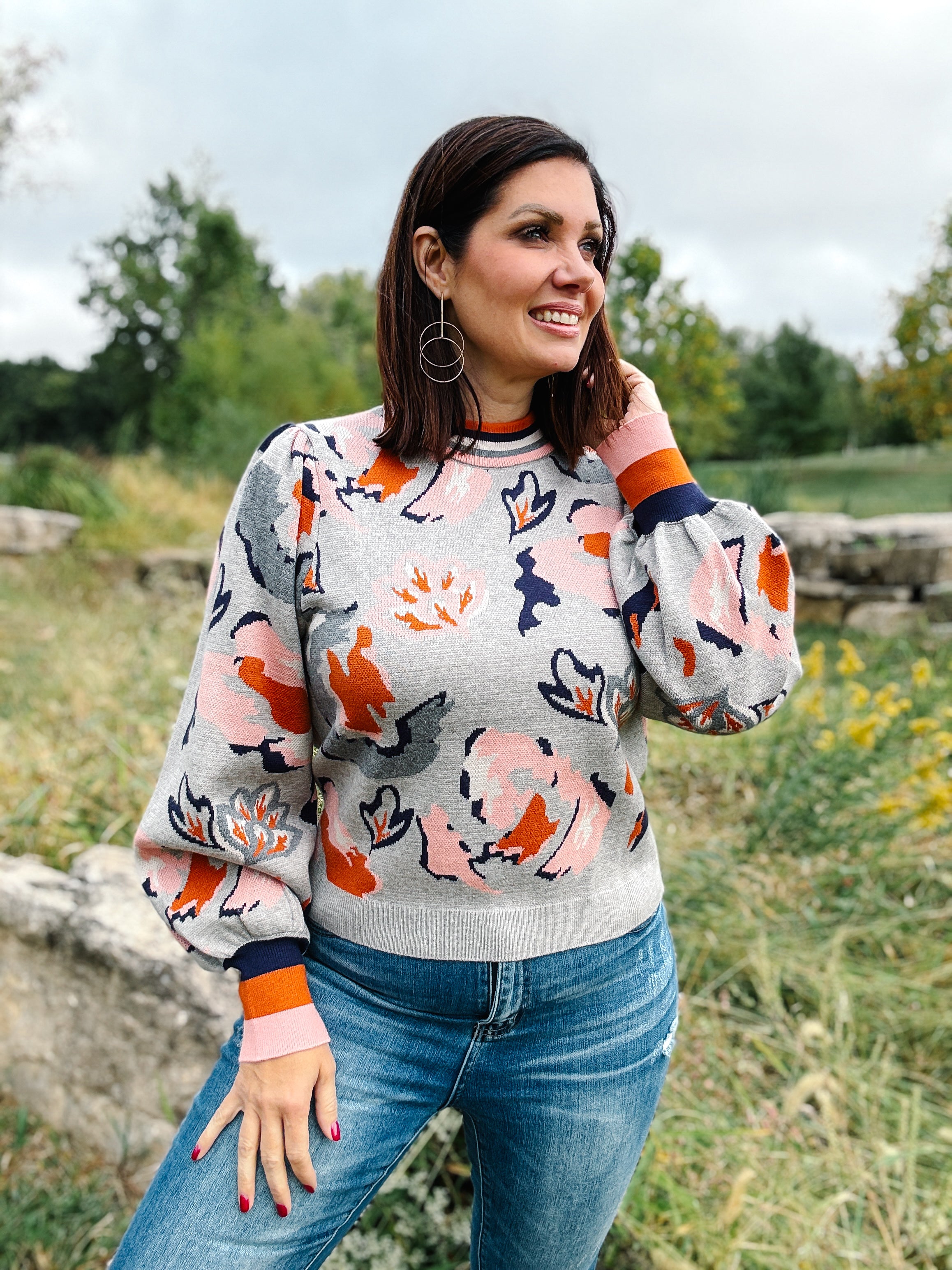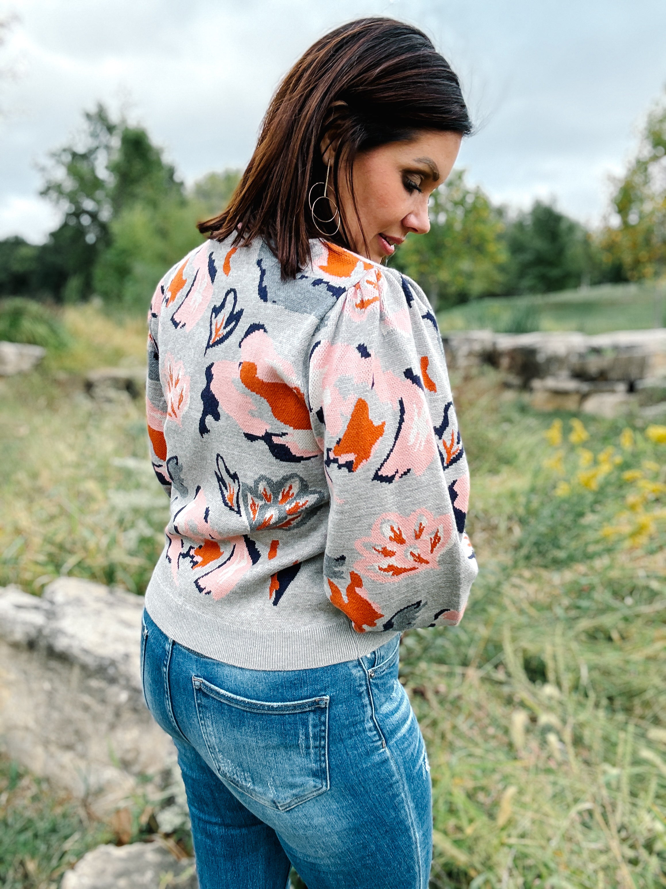Have you been searching for a standout THML grey sweater with bold fall florals, a modern puff sleeve, and a luxe feel that instantly elevates your everyday denim?