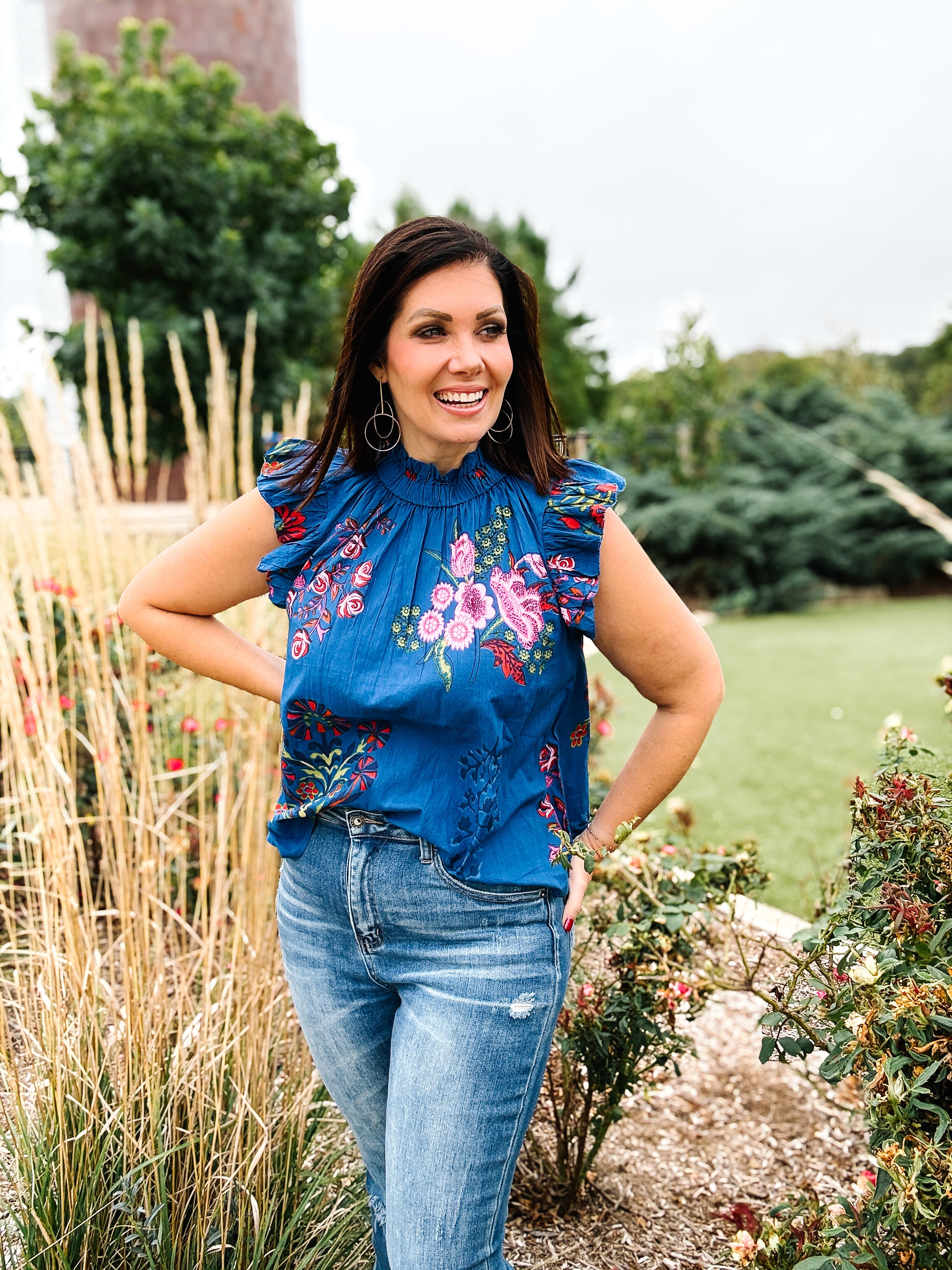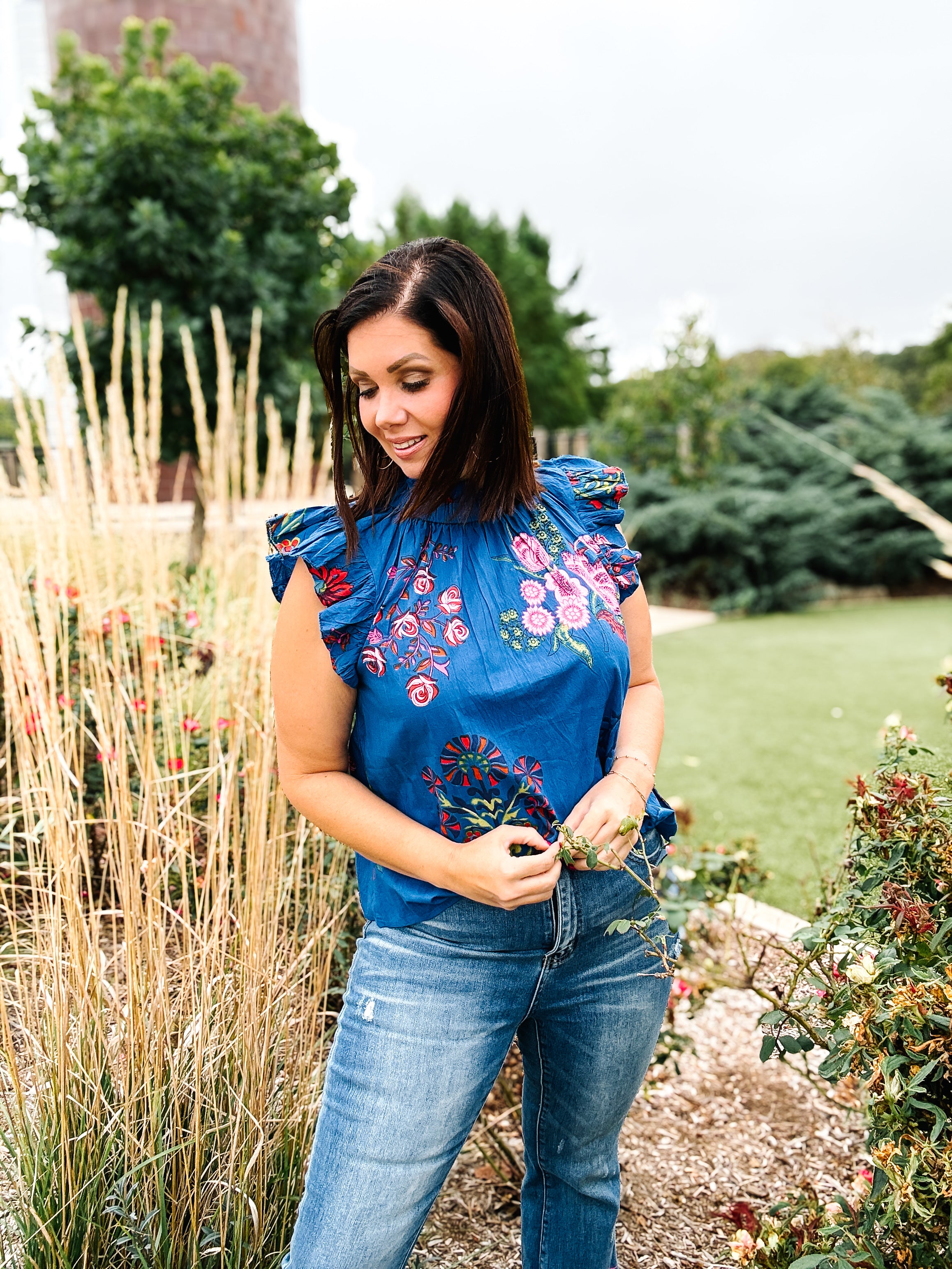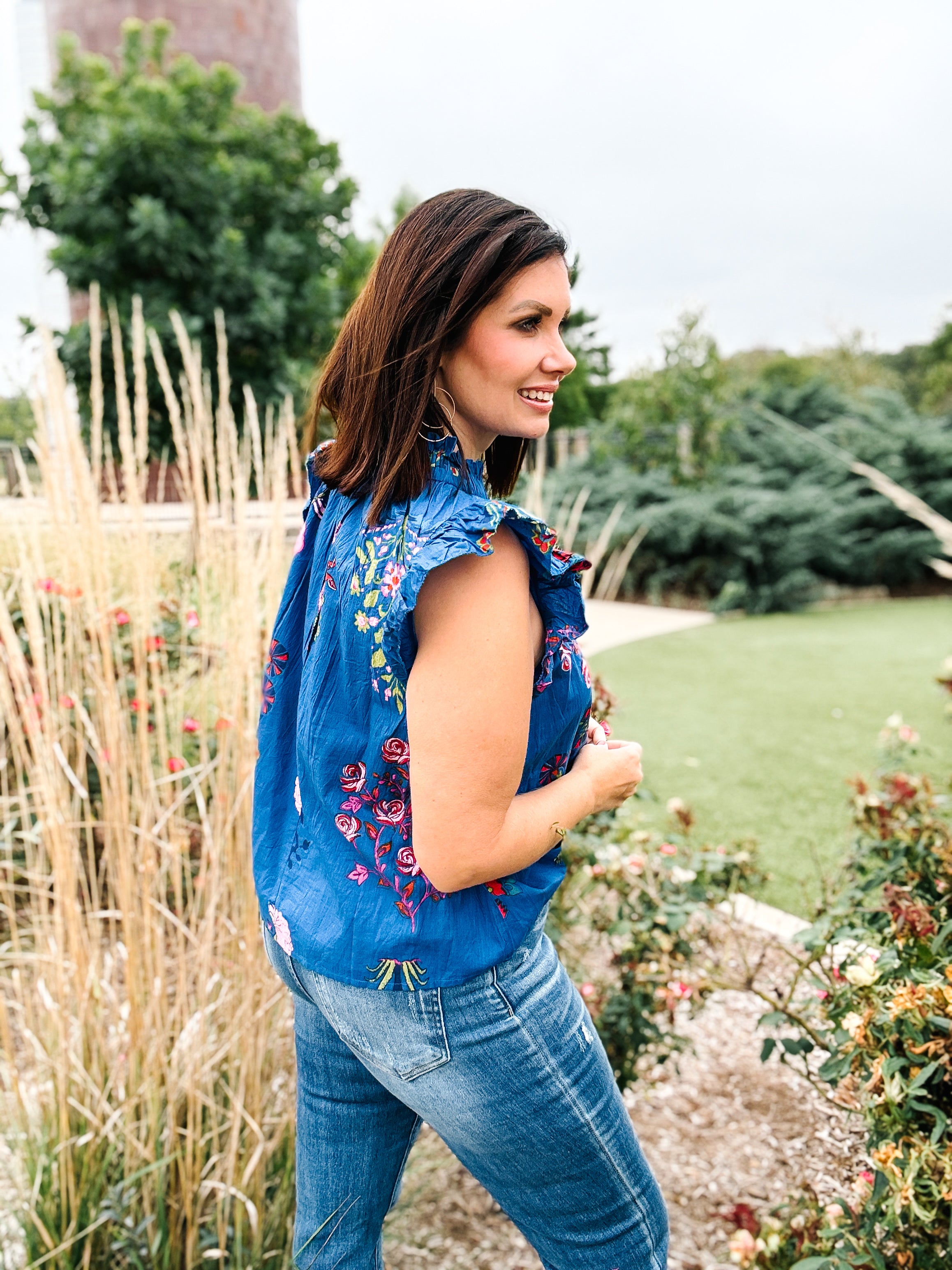 Have you been searching for a bold embroidered royal blue flutter sleeve blouse with vibrant floral detailing that instantly makes you feel alive and pulled together?