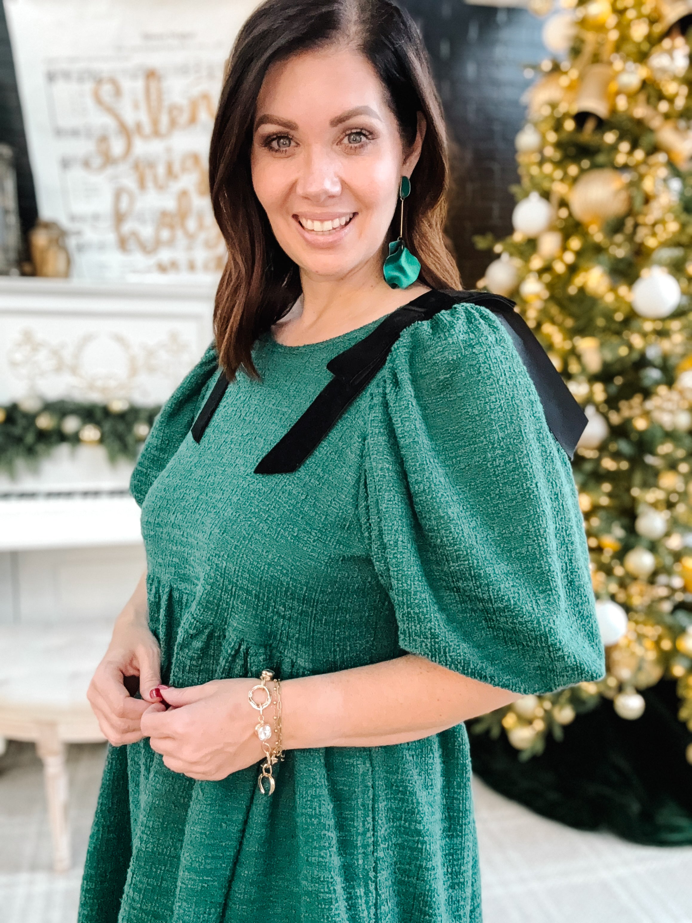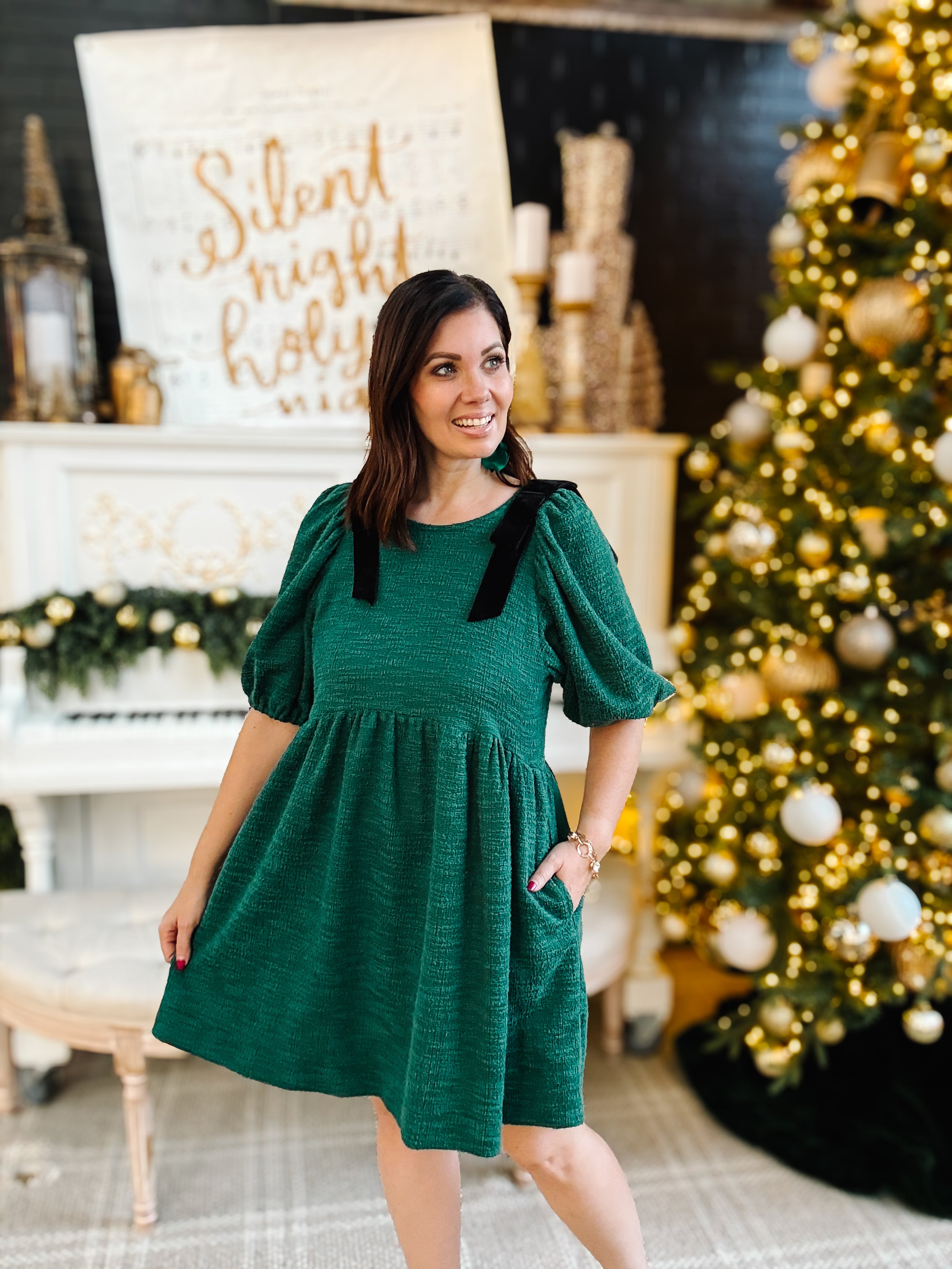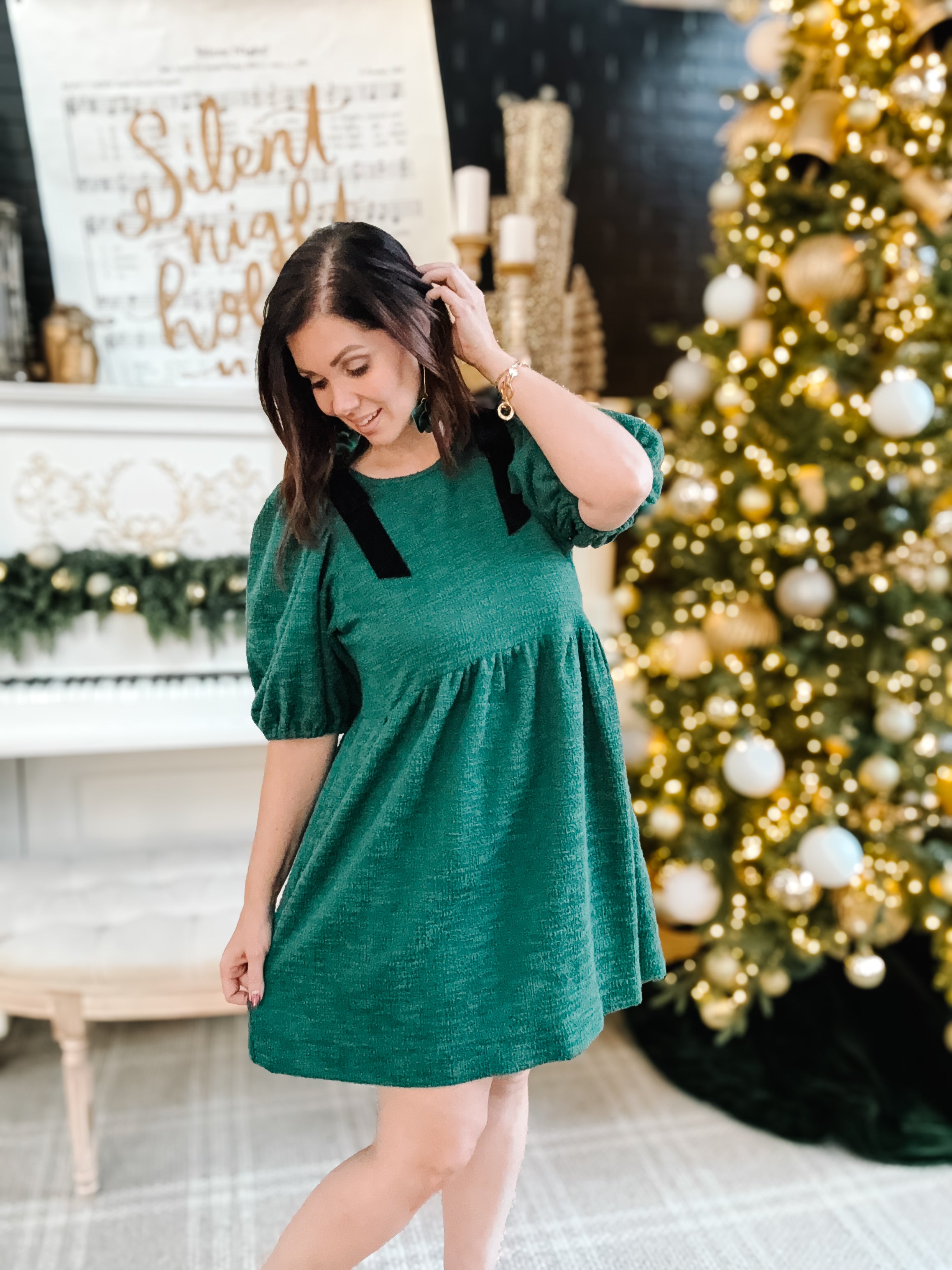 Have you been searching for the ultimate emerald green holiday dress with puff sleeves, velvet bows, and a silhouette that lets you eat the pie and take the picture? Meet the Delphine—a festive favorite that gives elegance without the effort.