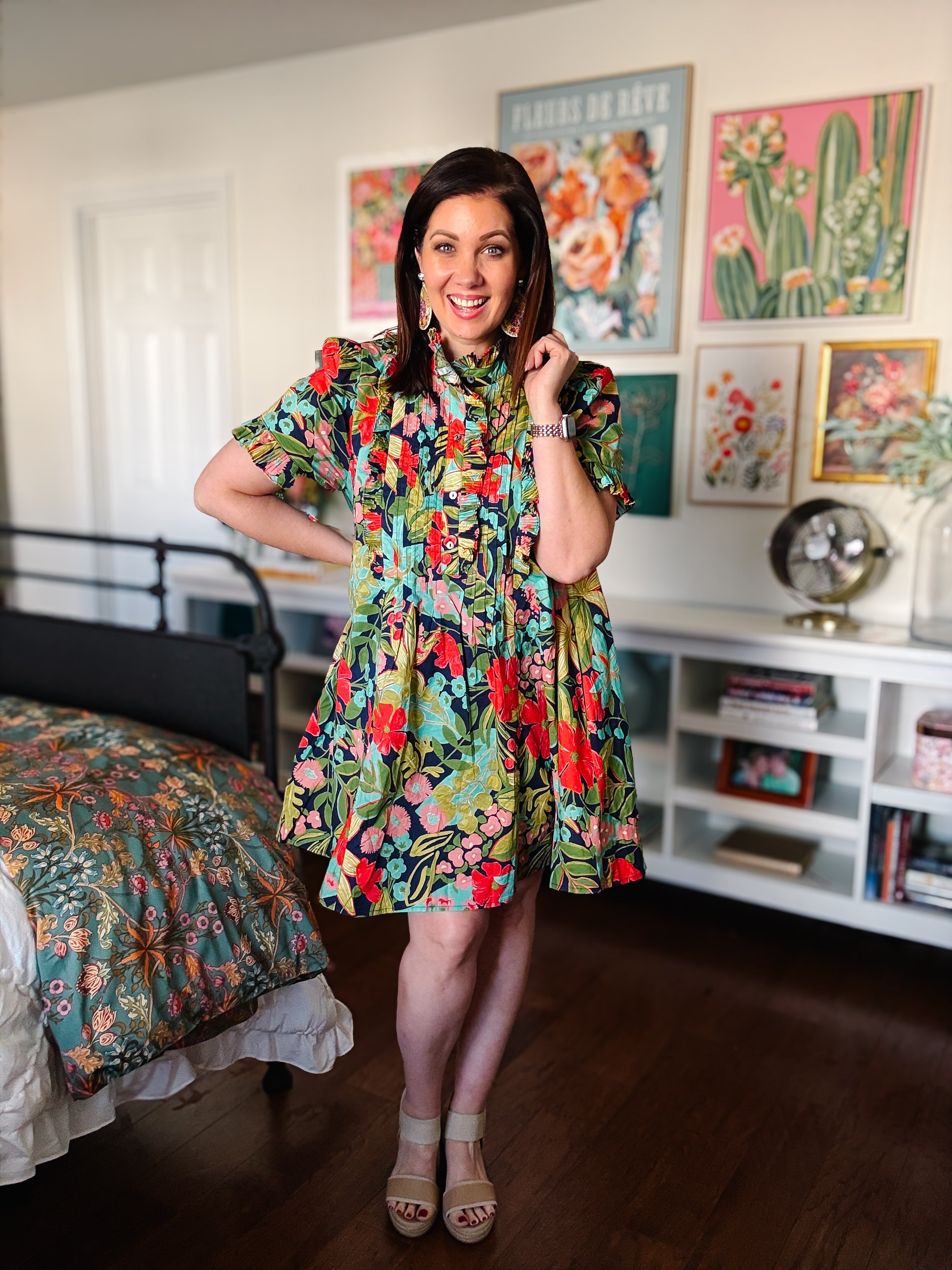 Have you been looking for a colorful floral mini dress with a high ruffle neckline, button-front details, and an easy swing fit that’s cute, comfy, and forgiving for spring and summer?