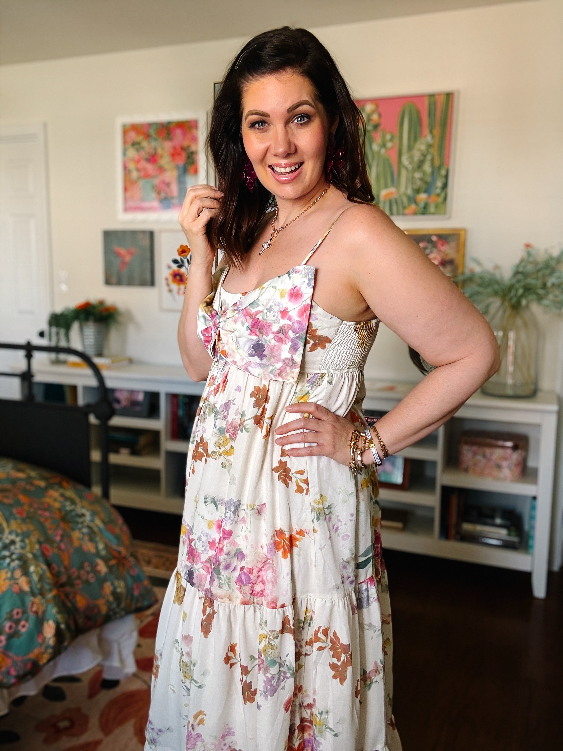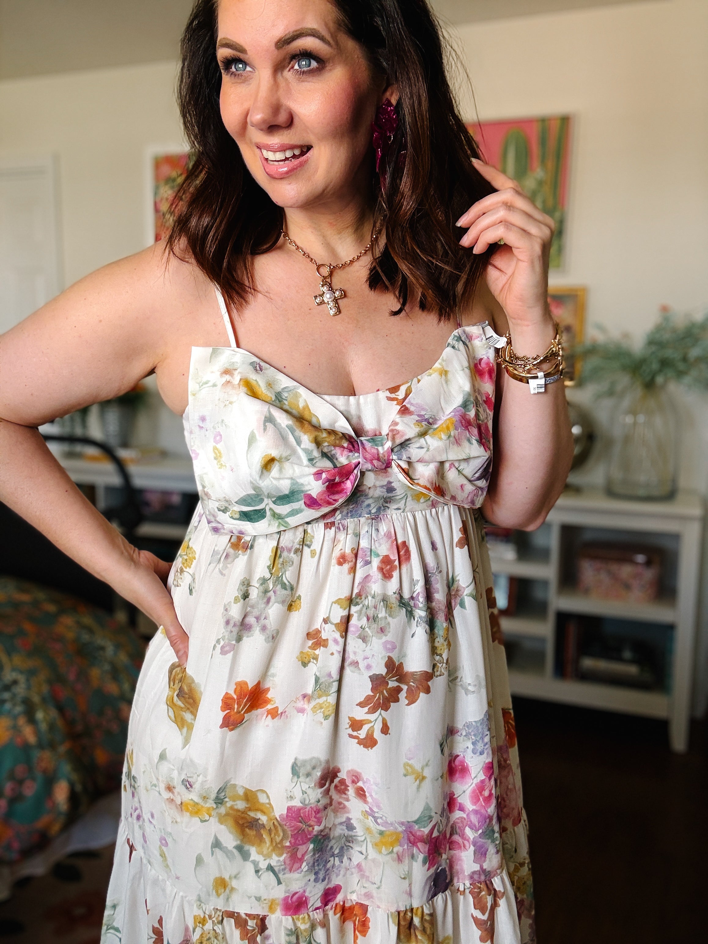Have you been looking for a romantic floral maxi dress with a flattering empire waist, statement bow bodice, and a flowy, body-forgiving fit you can wear for spring, summer, and beyond?