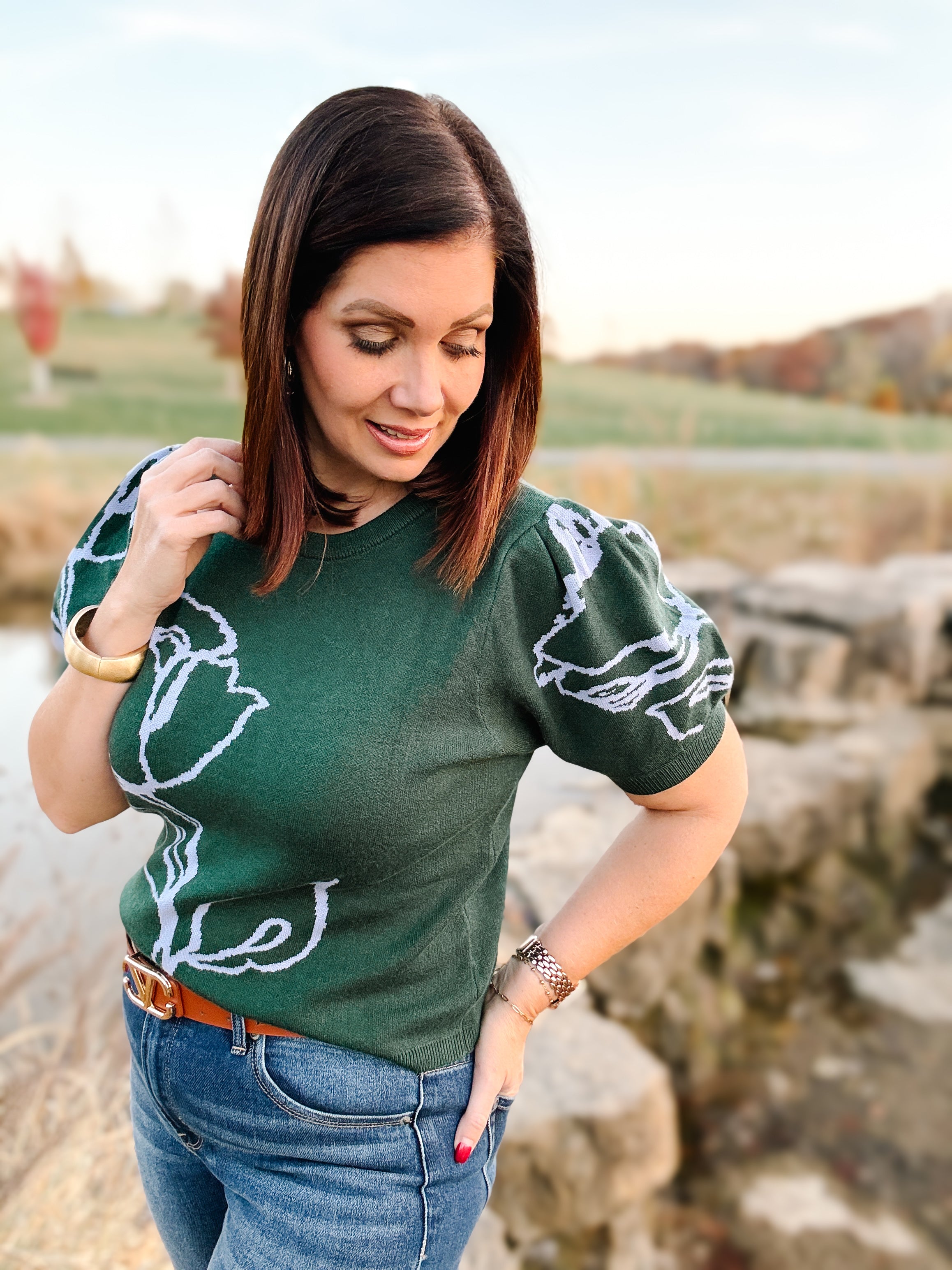 Isleen Sweater by THML - Hunter Green Short Sleeved Sweater with Abstract Floral Detailing