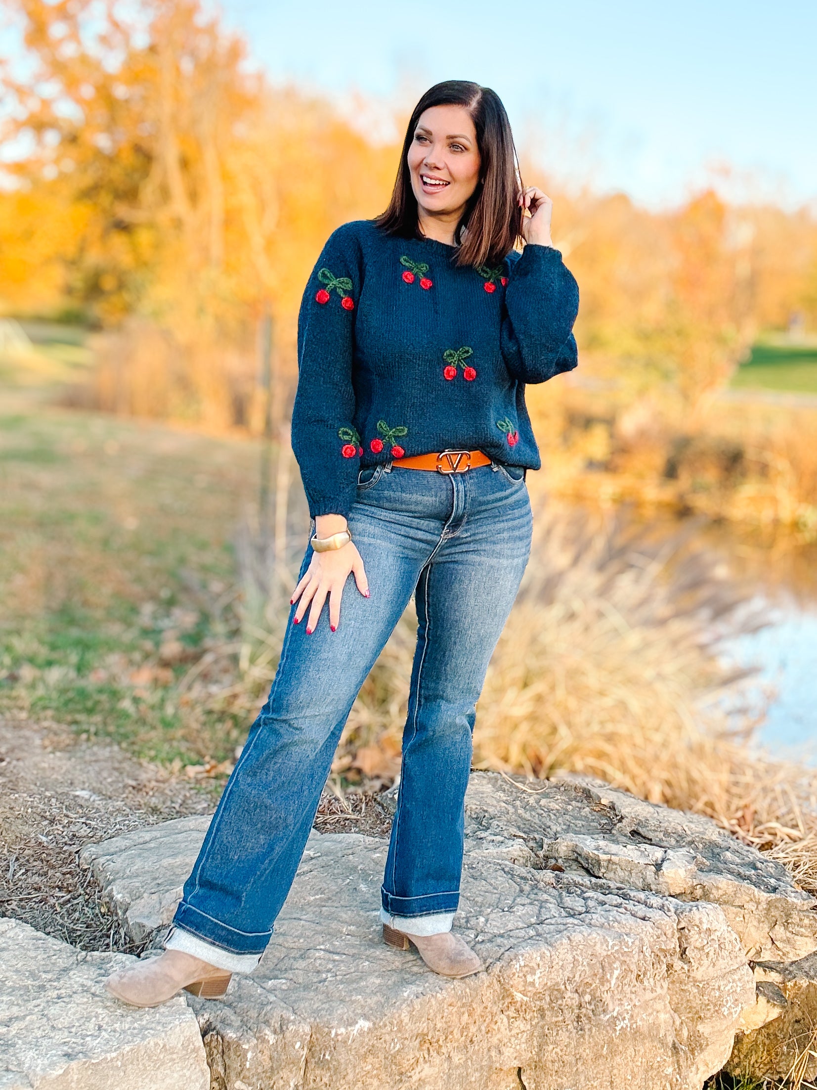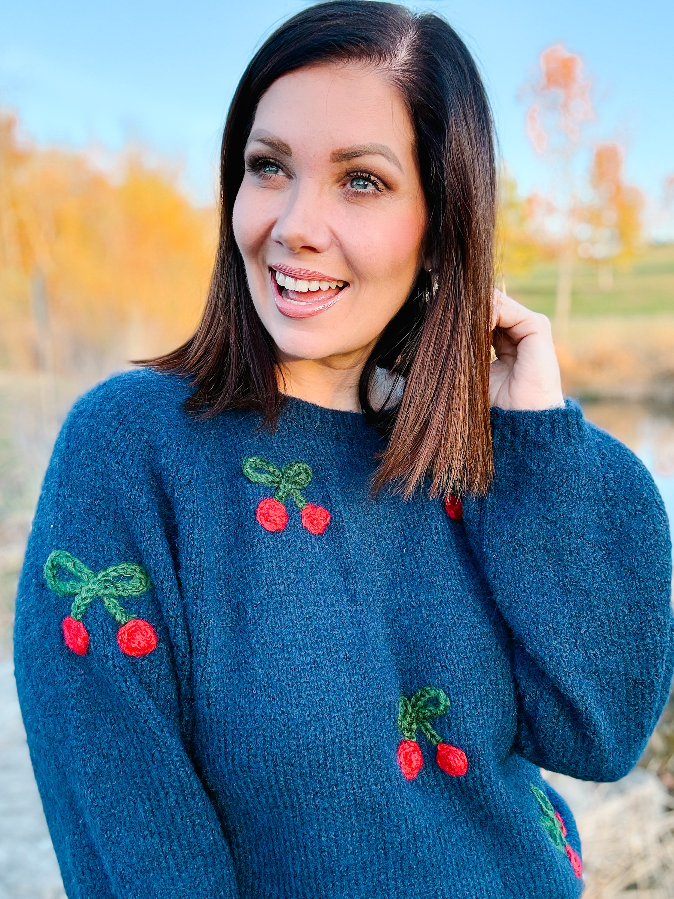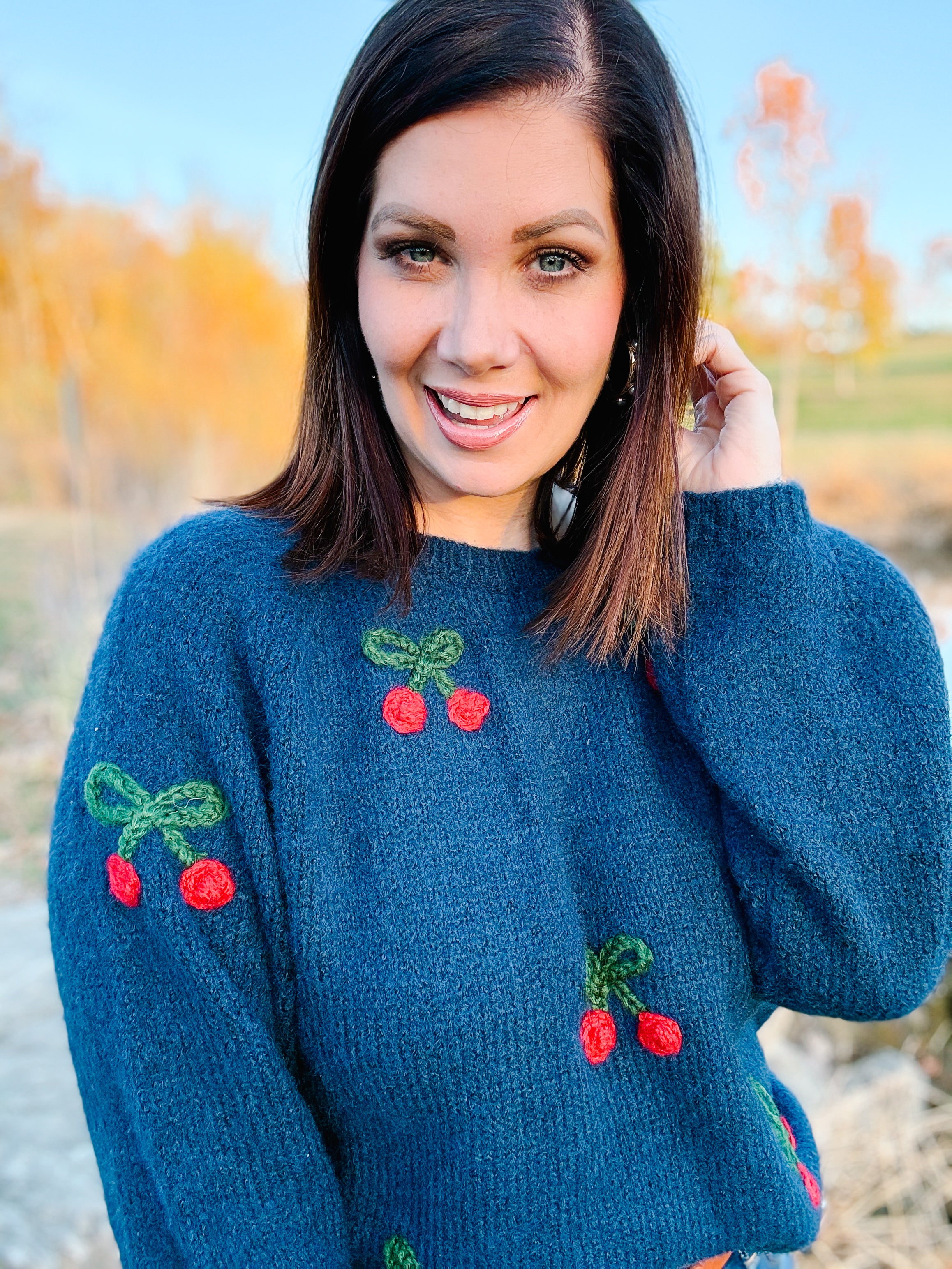 Have you been craving a playful, navy blue sweater with retro cherry embroidery that feels like a cozy 90s throwback—but make it boutique?