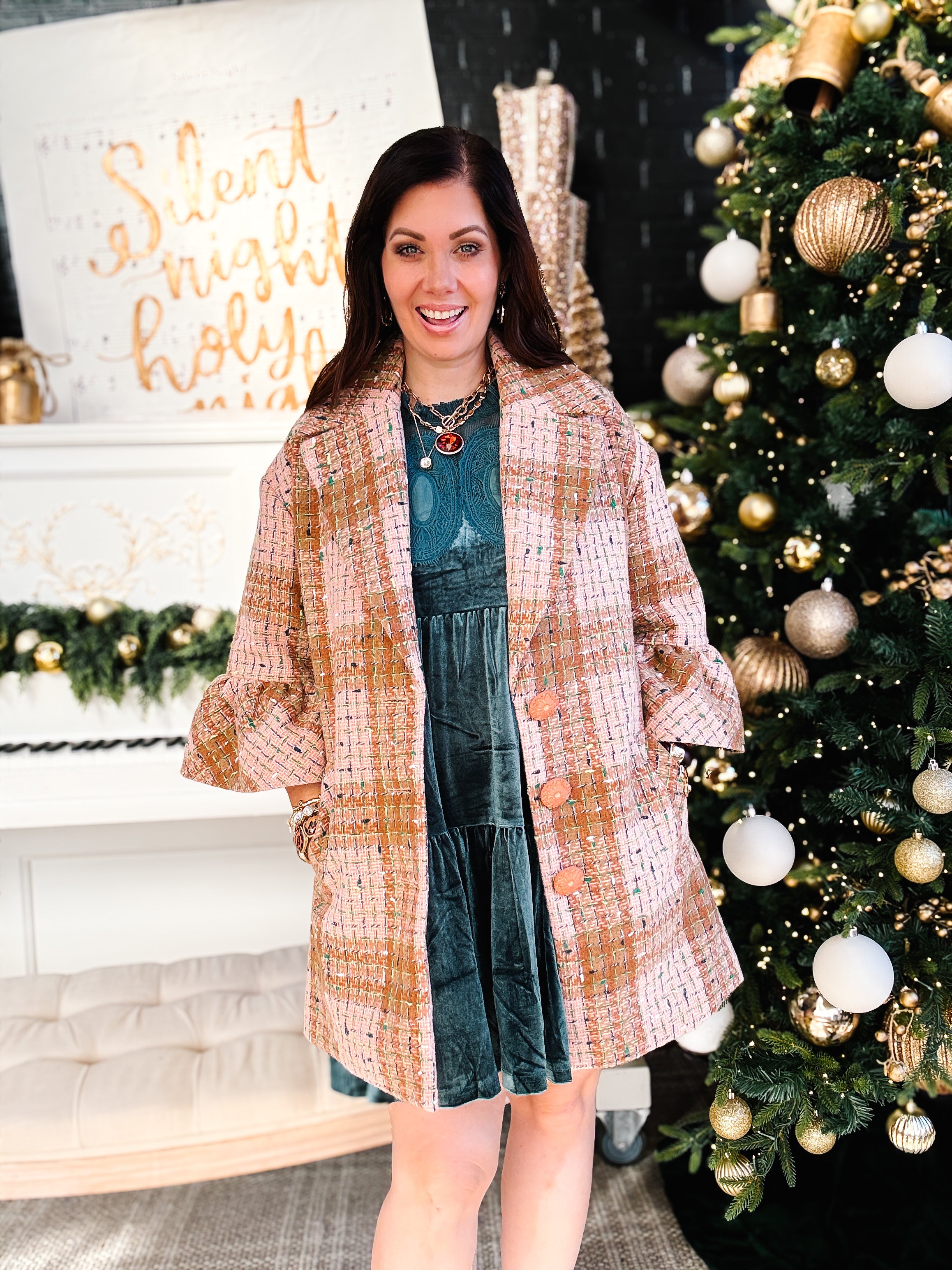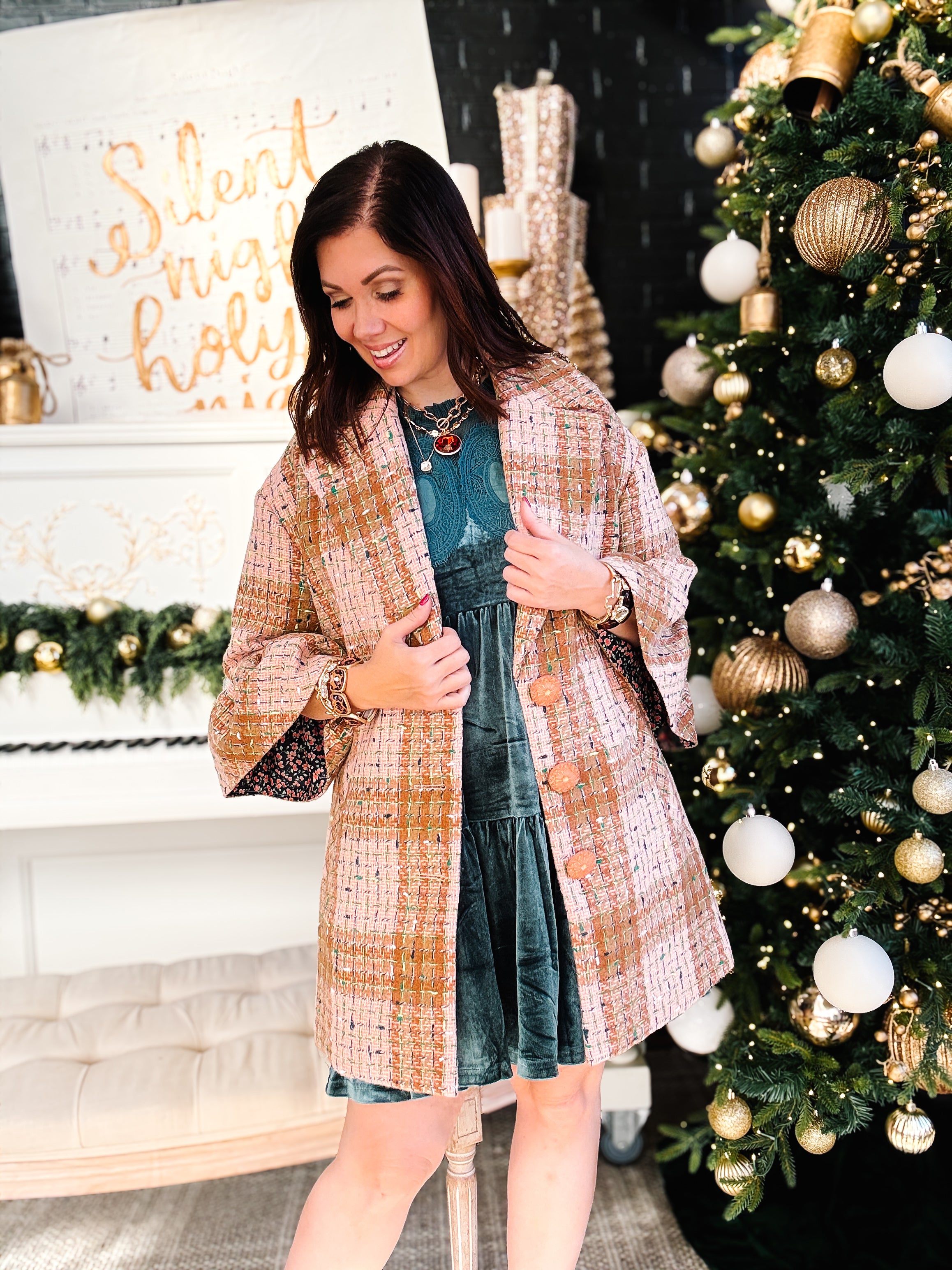 The Puff Sleeve Plaid Coat by Ivy Jane is pure couture energy—with every stitch, button, and detail designed to stop traffic and elicit compliments. The textured plaid weave in blush, rust, and emerald gives you a rich holiday palette without going full Mrs. Claus, while the oversized carved buttons and oversized ruffle-trimmed ¾ sleeves give a nod to mid-century drama. Fully lined in a floral print so chic you'll want to flash the inside, this coat proves Ivy Jane left no detail behind. It’s elegance meets attitude, and yes—she has main character energy.