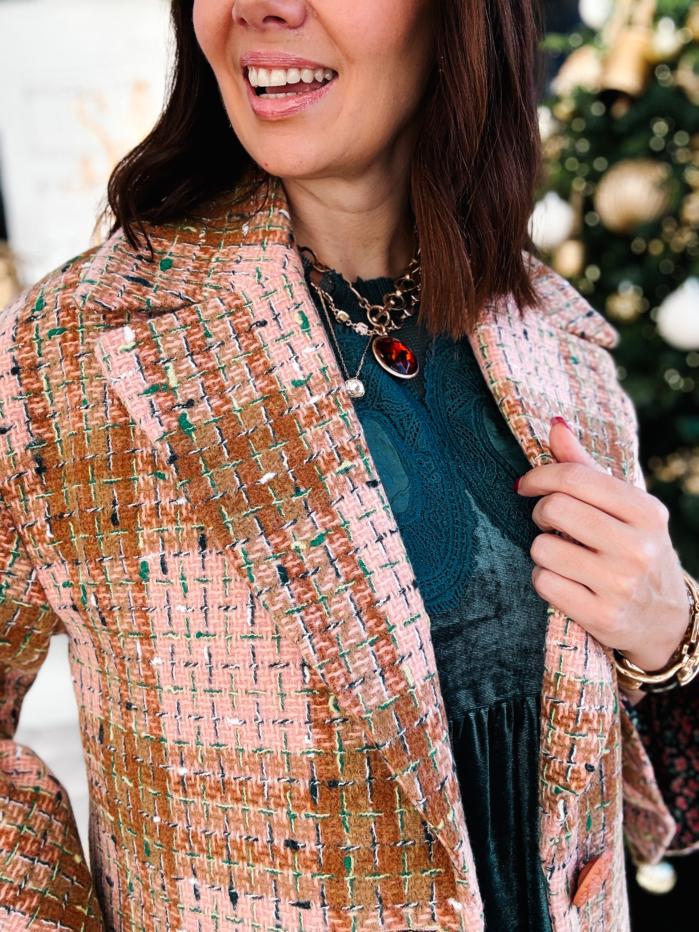• Luxe textured plaid in blush, rust, emerald + hints of white