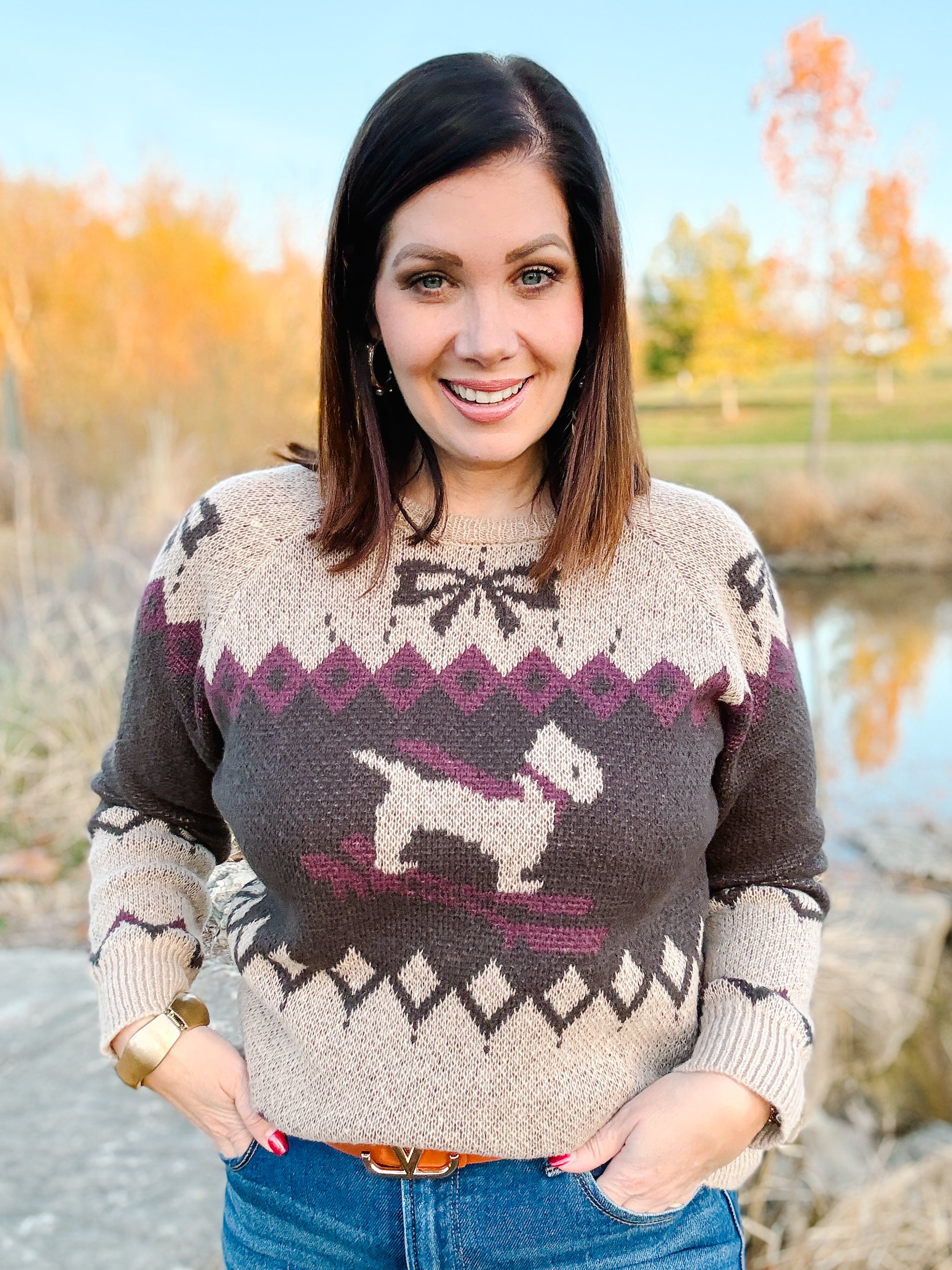 • Ivory, cocoa, and wine-toned fair isle pattern with dog graphic