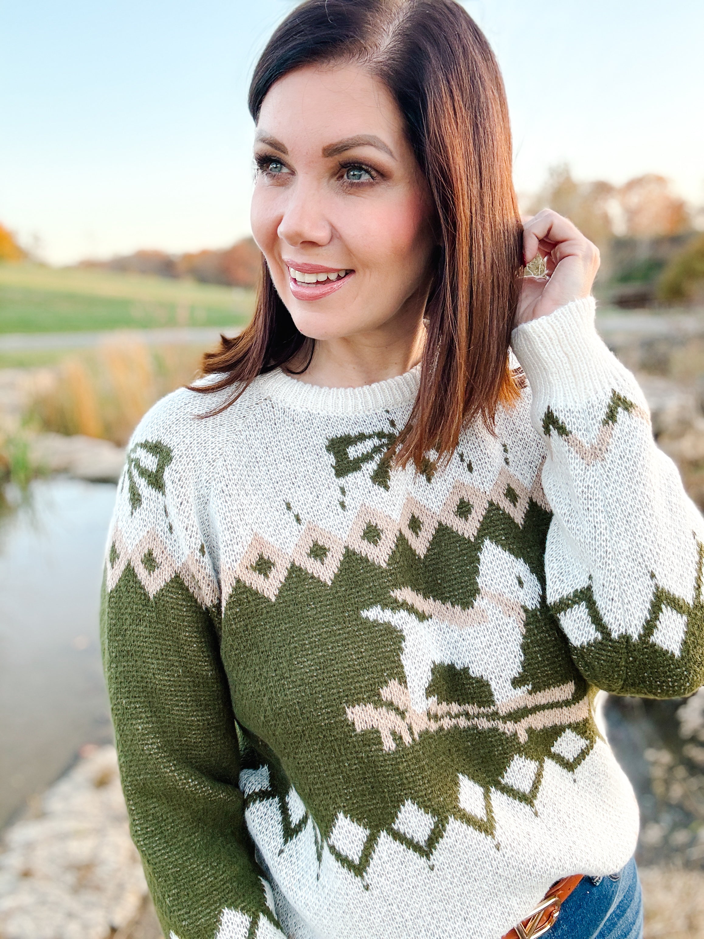 Have you been searching for the coziest green and cream holiday sweater with a nostalgic winter fair isle pattern and the most charming little pup on skis?