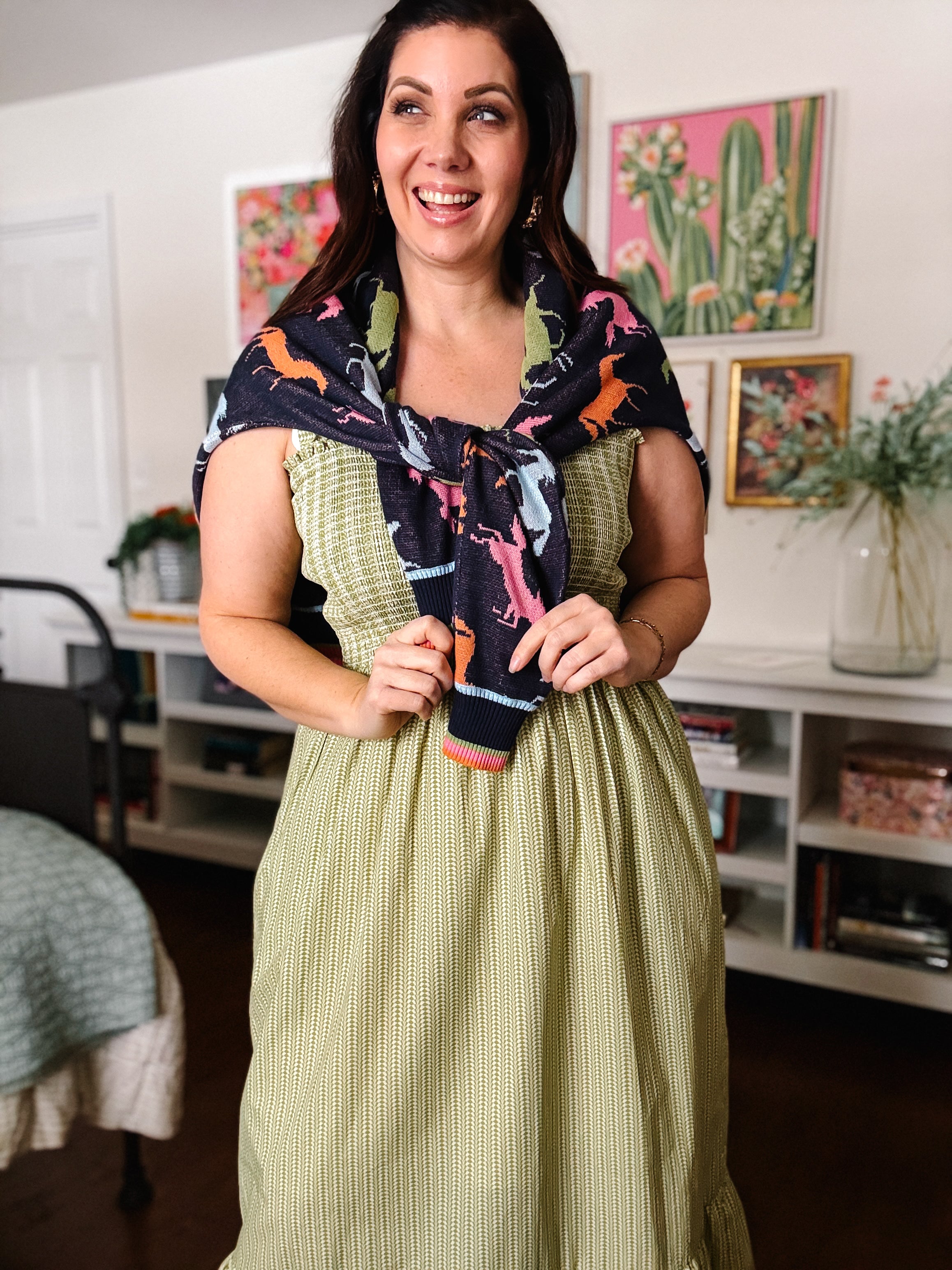 Whether you’re dropping kids at school or layering up for a brunch date, this soft navy base with its rainbow herd of horses brings a little yeehaw to your everyday look. We especially love it paired with our Cecily Dress—the combo of the smocked neckline, tiered skirt, and this cheerful sweater slung over your shoulders is effortless outfit gold.
