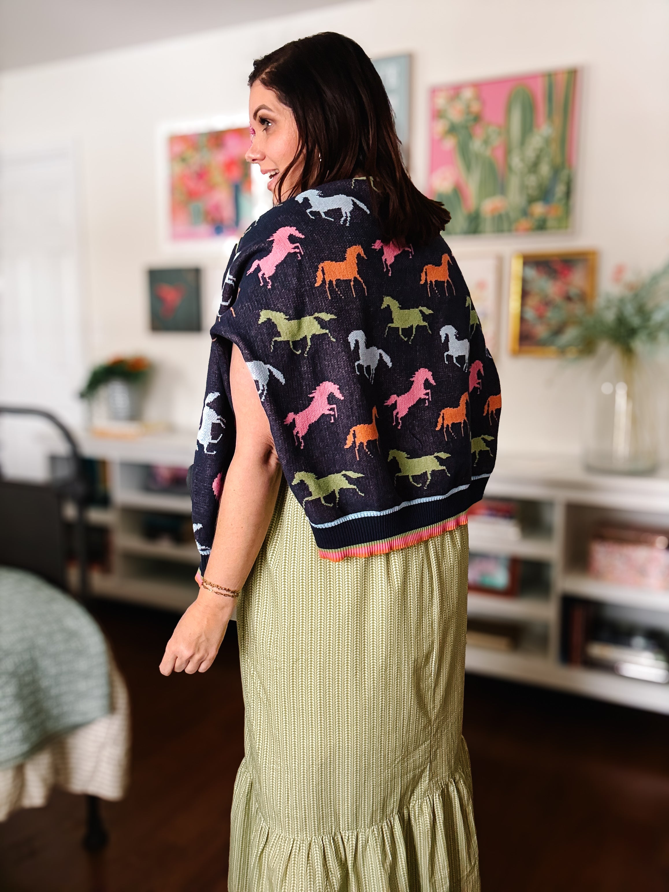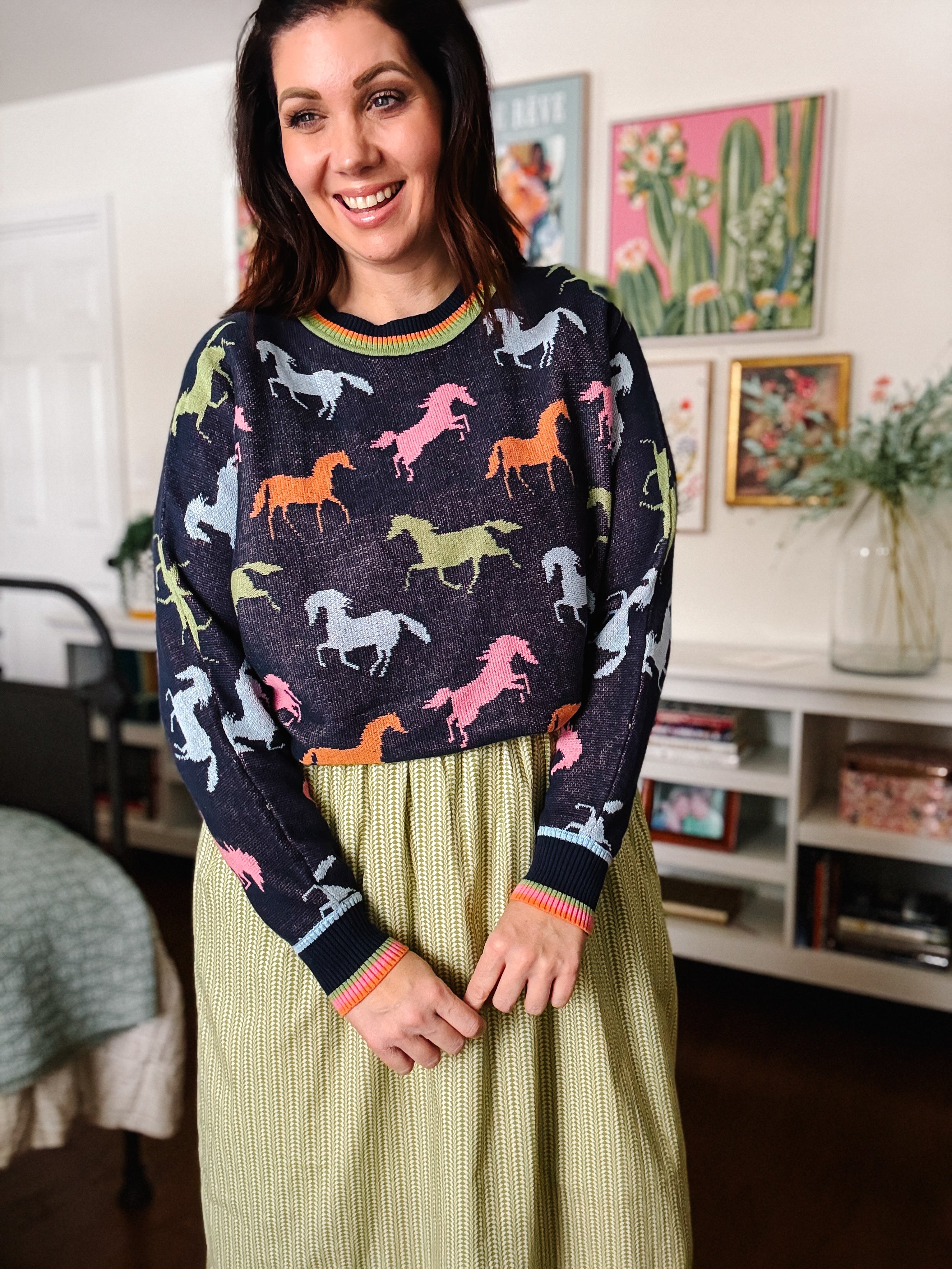 Looking for a playful navy blue and colorful horse-print sweater that layers like a dream and adds instant joy to any outfit? Meet the Tansy Sweater—a quirky, cozy knit that’s impossible not to smile in.